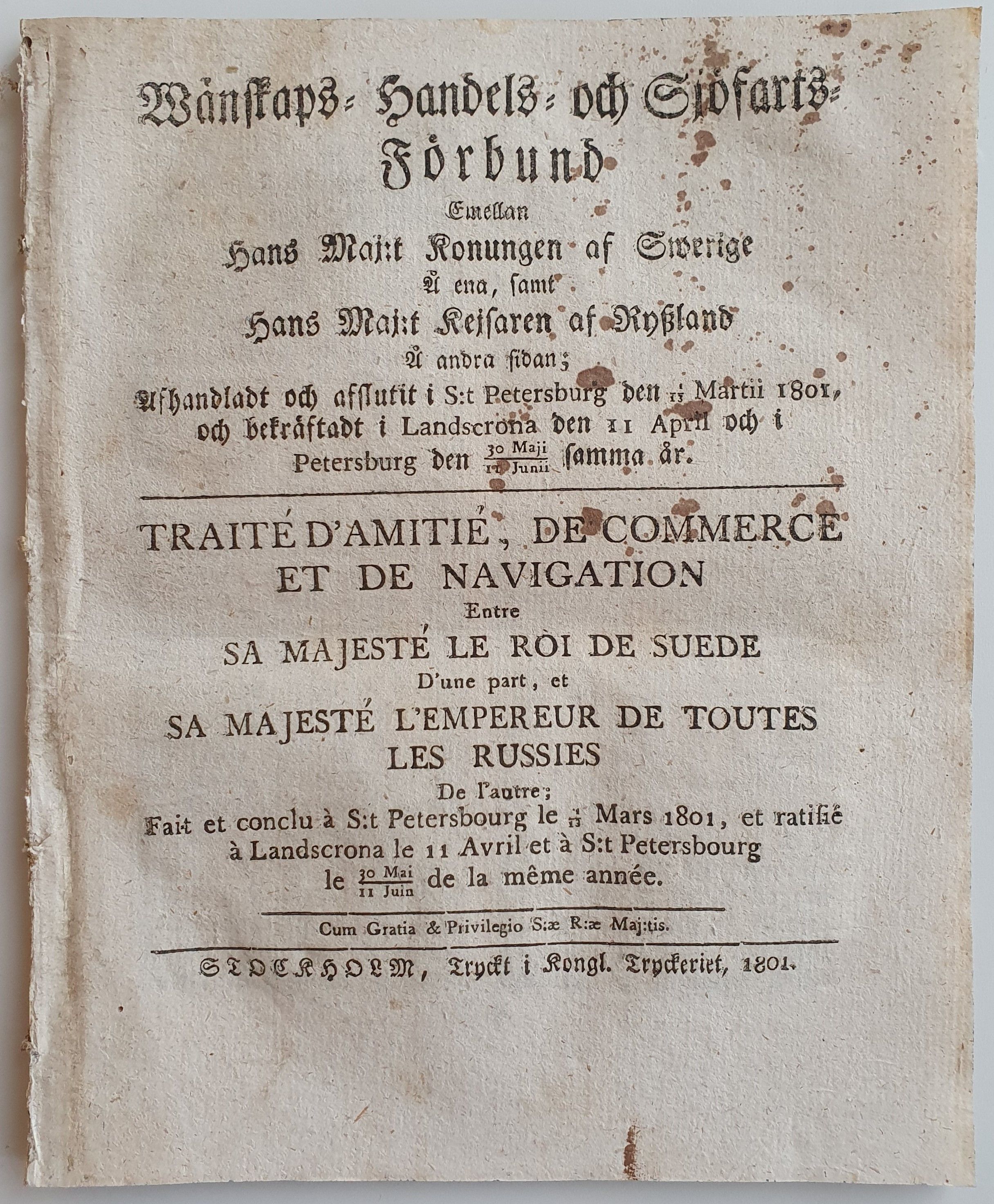 Wänskaps- Handels- och Sjöfarts-Förbund emellan Hans Maj:t Konungen af Swerige å ena, samt Hans Maj:t Kejsaren af Ryssland å andra sidan; Afhandladt och afslutit i S:t Petersburg den 1/13 Martii 1801, och bekräftadt i Landscrona den 11 April och i Petersburg den 30 Maji / 11 Junii samma år. / Traité d'Amitié, de Commerce et de Navigation entre sa Majesté le Roi de Suede d'une part, et sa Majesté l'Empereur de toutes les Russies de l'autre; Fait et conclu à S:t Petersbourg le 1/13 Mars 1801, et ratifié à Landscrona le 11 Avril et à S:t Petersbourg le 30 Mai / 11 Juin de la même année.