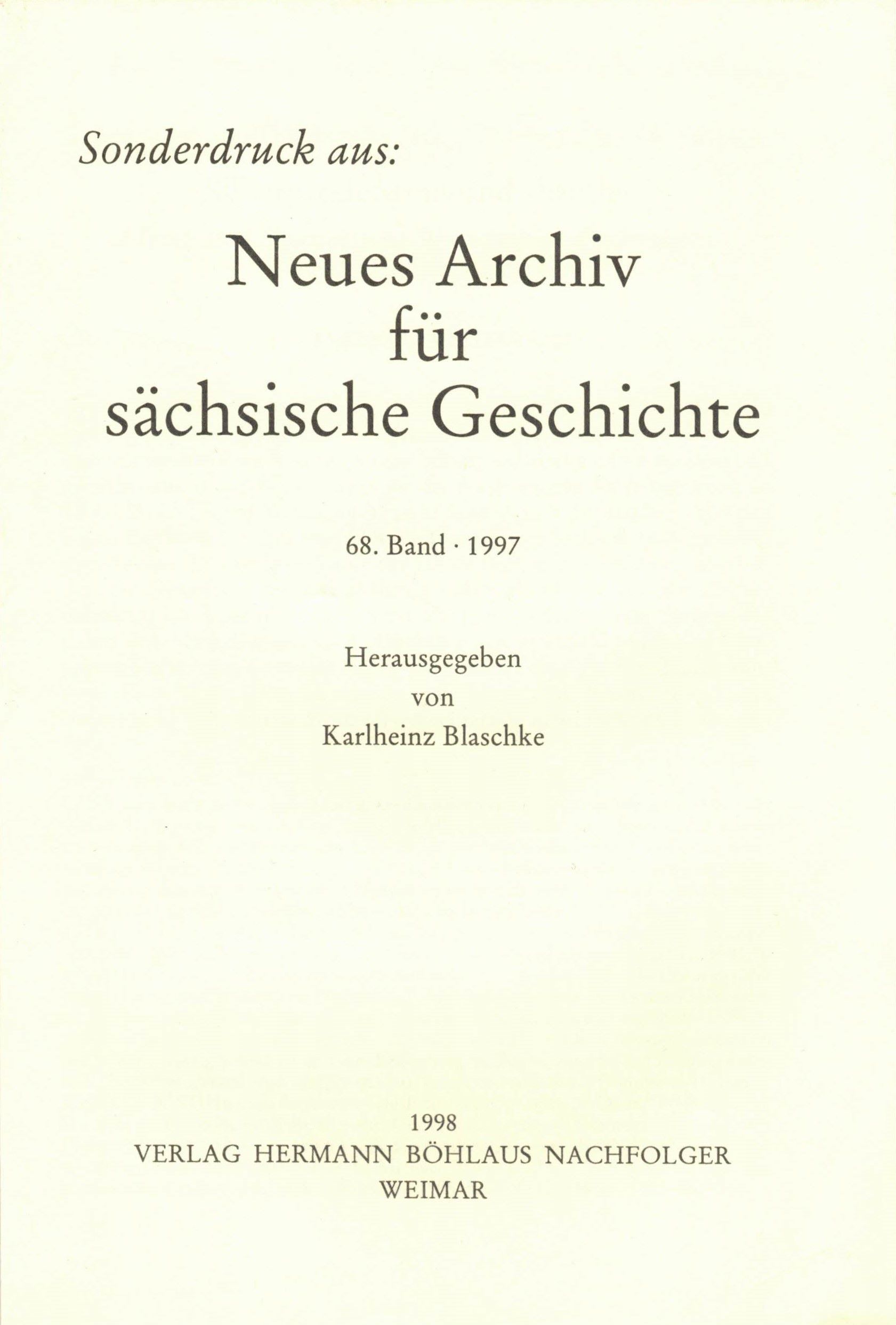 Sonderdruck aus Neues Archiv für sächsische Geschichte 68. Band 1997. Weimar: Hermann Böhlaus, 1998. Pp. 47-65. Publishers printed wrappers. Inscribed by the author on first page. 21 x 14,5 cm.