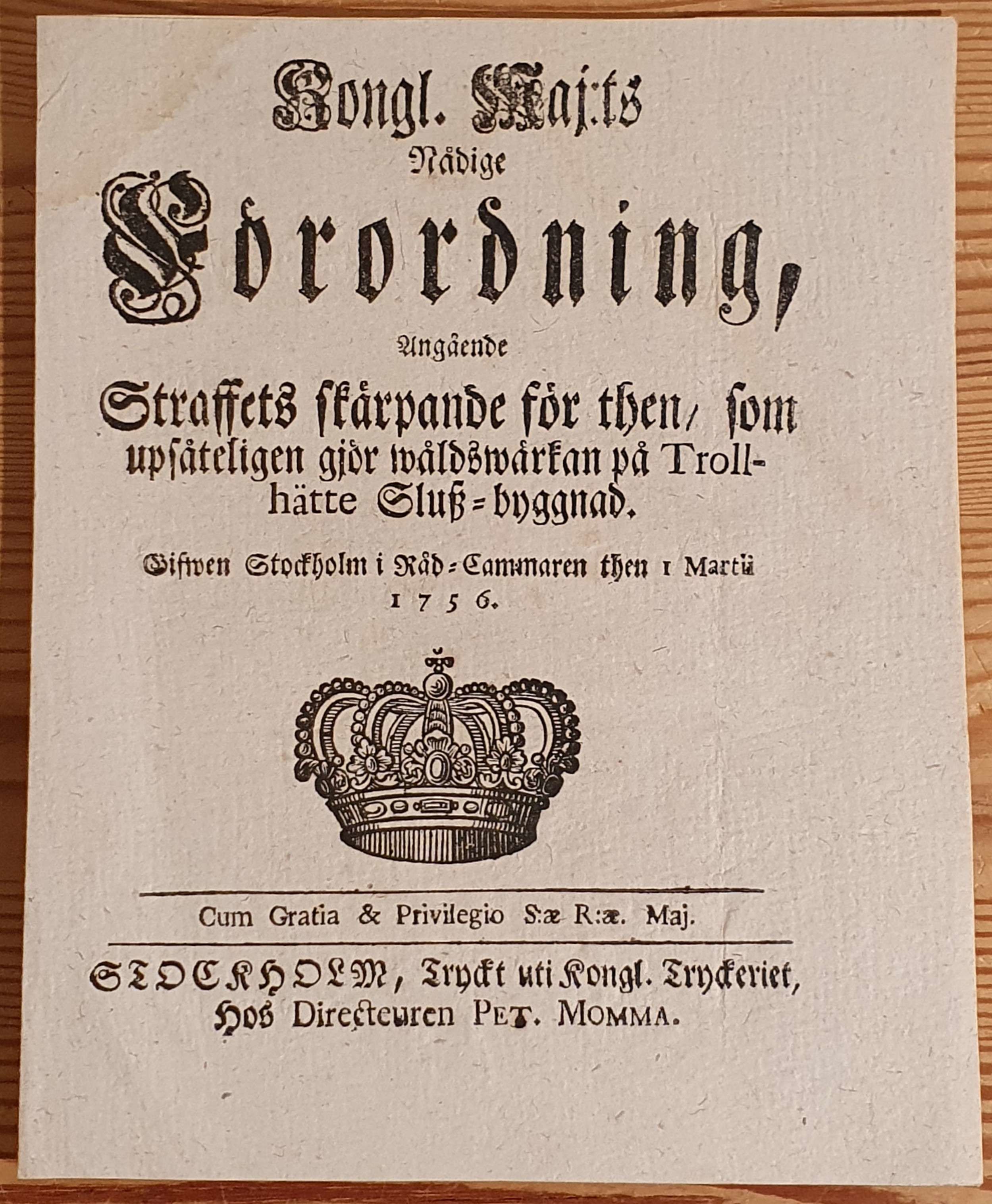 Kongl. maj:ts ultimate nådige förordning, angående straffets skärpande för then, som upsåteligen gjör wåldswärkan på Trollhätte sluss-byggnad.