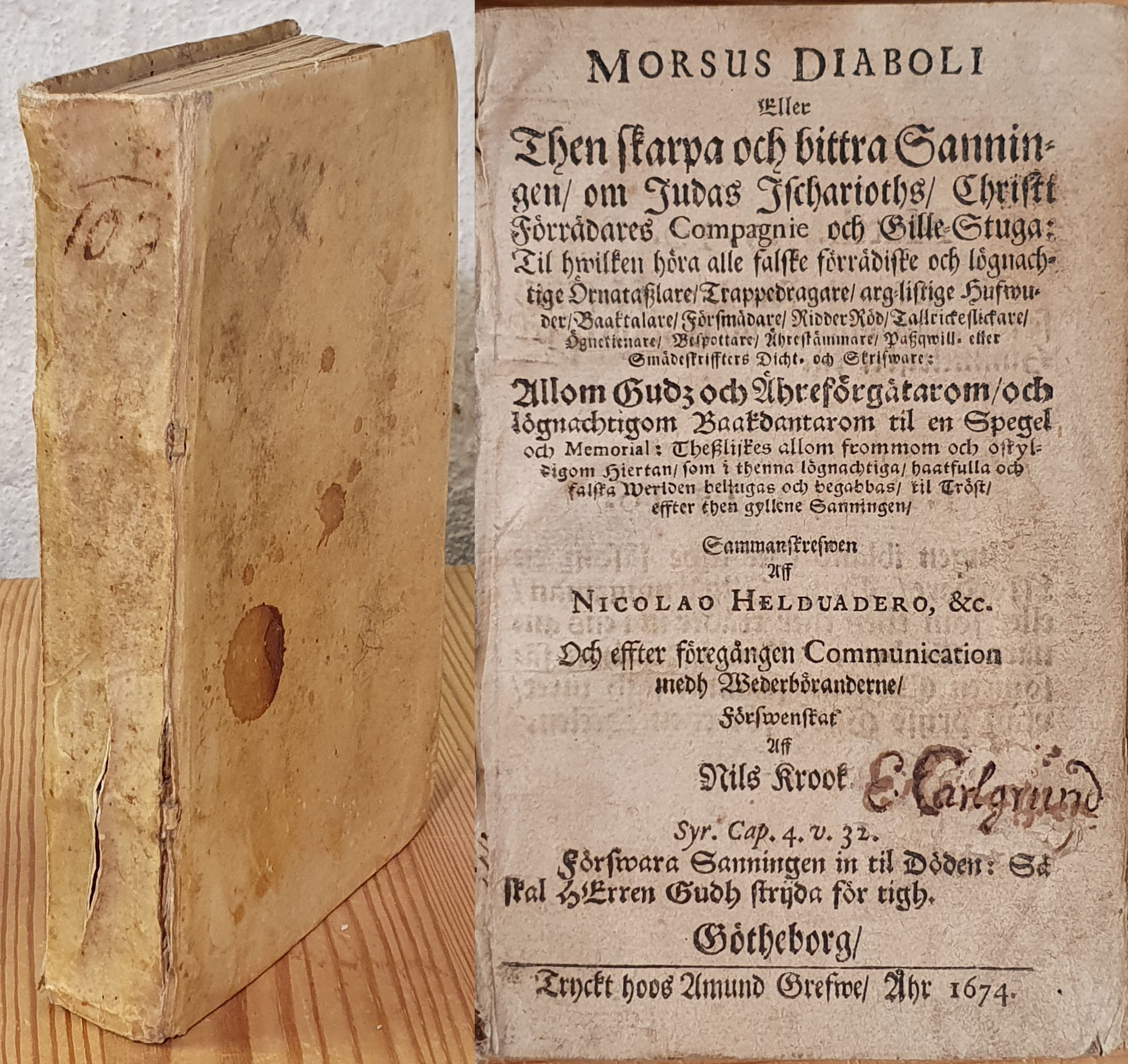 Sammanskrefwen aff Nicolao Helduadero, &c. och efter förgången communication medh wederböranderne, förswenskat aff Nils Krook. Göteborg: Amund Grefwe, 1674. 8:o. (32),124 + (2),146,149-162 s. OBS! saknar ett blad i andra delen, sid. 147/148. Med träsnitt i form av en gripliknande djävul på första sidan till andra delen. Samtida nött och fläckat pergamentband med ett par sprickor i ryggen. Fria försättsbladen saknas. Ett par små hål i titelbladet till följd av en raderad och senare ifylld namnteckning. Sid 35/36 med pappersförlust i marginalen. Lite lagerfläckar i marginalerna och vid nedre hörn samt lagerfläckar i texten på sid. 49/50. En bläckfläck i texten på sid. 27/28 i andra delen och en liten pappersmista i yttermarginalen på samma blad. Fläck i marginalen på sid. 101 i andra delen. Ljusa fuktränder och lite solkfläckar på de sista sidorna, reva i marginalen på sid. 153/154. Namnteckning på titelbladet E. Carlgrund(?) samt gammal notering på insidan av bakre pärm "Denna book ähr mig förährad af (???) Gustav Bagge den 21 jan: 1677", det undertecknade namnet raderat. 16 x 10 cm.