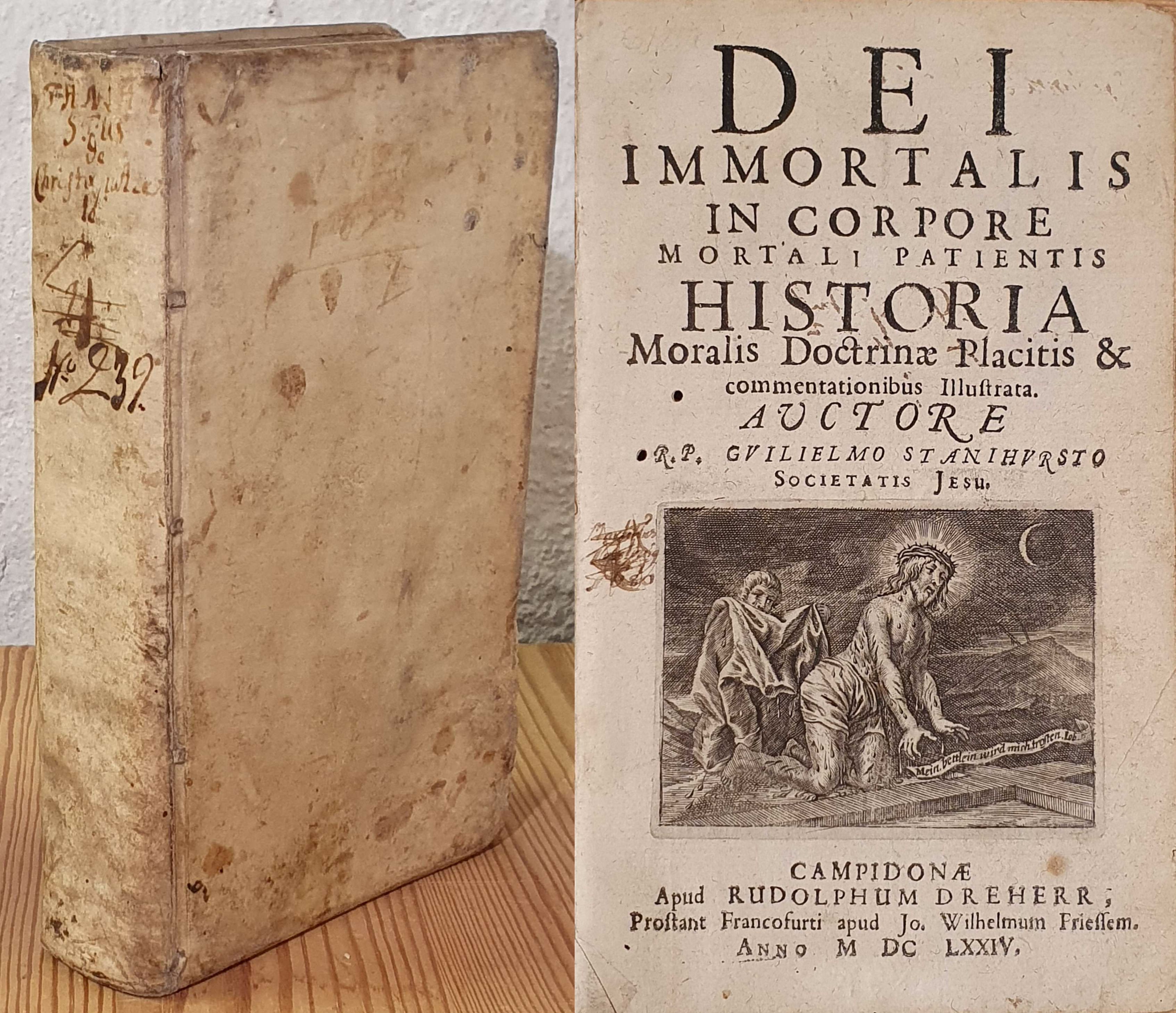 Auctore R.P. Guilielmo Stanihursto, societatis Jesu. Campidonae (Kempten), Rudolph Dreherr, 1674. 8:o. (22),408,(7) pp. Probably one leaf wanting in the preface. Engraving at the title-page and 2 full-page engravings in the preface. Contemporary vellum. A couple of wormholes from the inside of front board to p. 206. Paste-down papers cut out. Old ink notes and a piece missing at outer edge of ffep. Binding stained and worn with a piece missing at outer edge of upper board. With the owners signature of Mårten Torslow on ffep. (Martinus Torslovius Anno 1680) 18 x 11 cm.