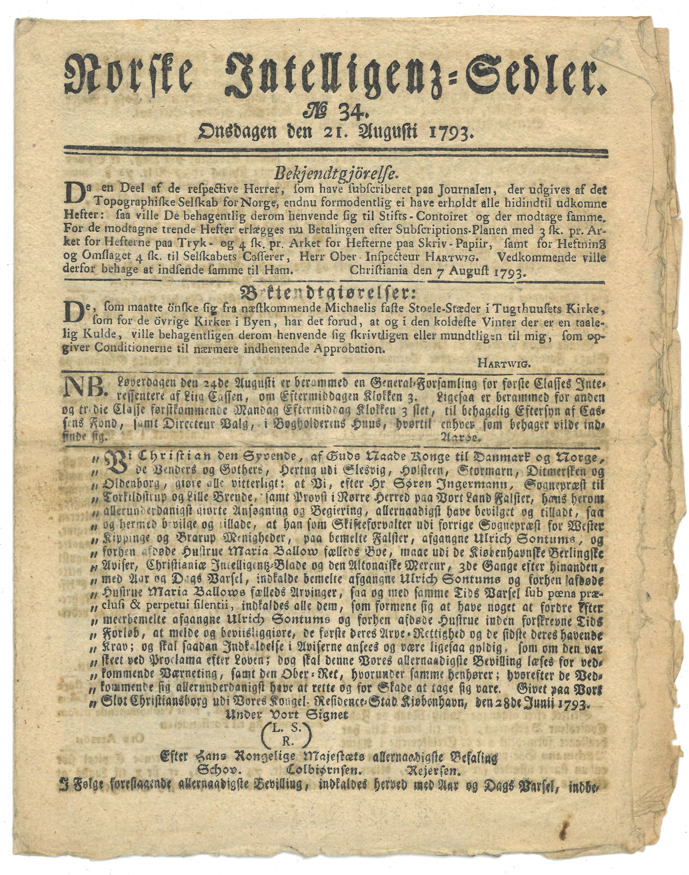 Norske Intelligenz-Sedler. No. 34. Onsdagen den 21. Augusti 1793.