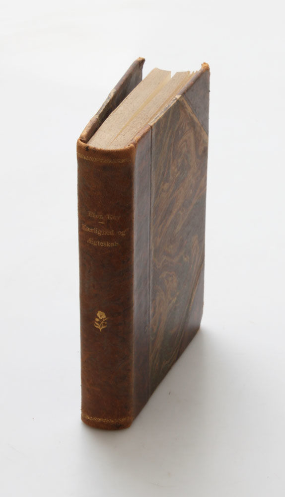 København og Kristiania: Gyldendalske Boghandels Forlag, 1905. 8vo. Indbundet i samtidigt flammet kalv med titel i guld. (8), 431 pp. Samtidig tilskrift foran. First Danish / Norwegean edition of Swedish feminist Ellen Key's essays on motherhood, education and psychology. She was highly influencial (and controversial) in her time and her ideas helped creating state child support.