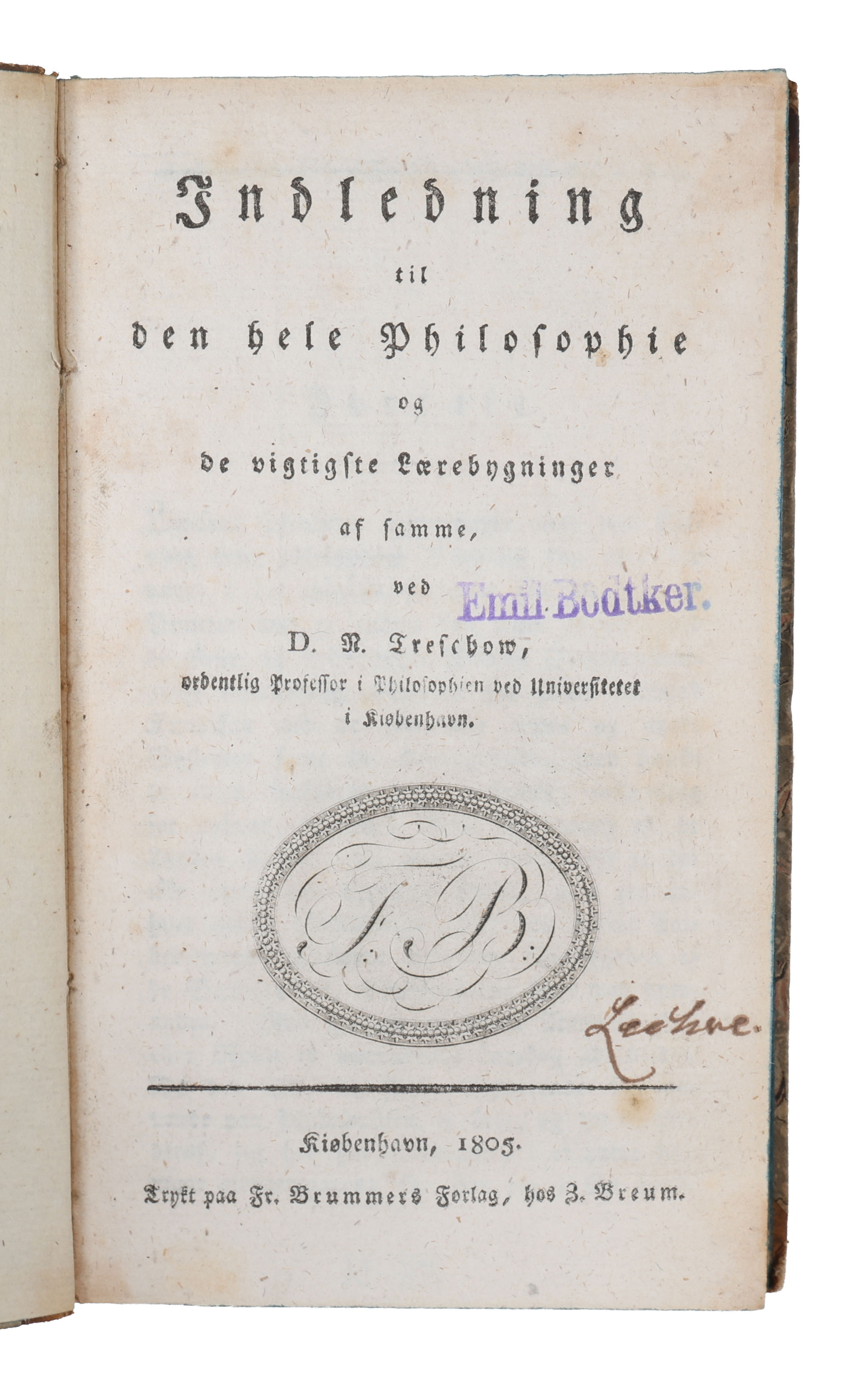 Kiøbenhavn, Brummers Forlag, 1805. 8vo. In contemporary half calf. Spine with stains and wear. All edges coloured in blue. Previous owner's name and a stamp to title-page, a few underlinings in contemporary hand throughout, otherwise a good copy. (4), 210, (3) pp. First edition of Treschow’s foundational propaedeutic introduction to the history of philosophy, a key work in late-18th century Scandinavian philosophical pedagogy.