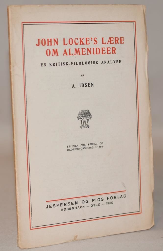 Jespersen og Pios Forlag, 1930. 49 sider. Hæftet Pænt eksemplar, dog med lette ydre spor. En analyse af den kendte engelske filosof John Lockeslære om almenideer. Dansk