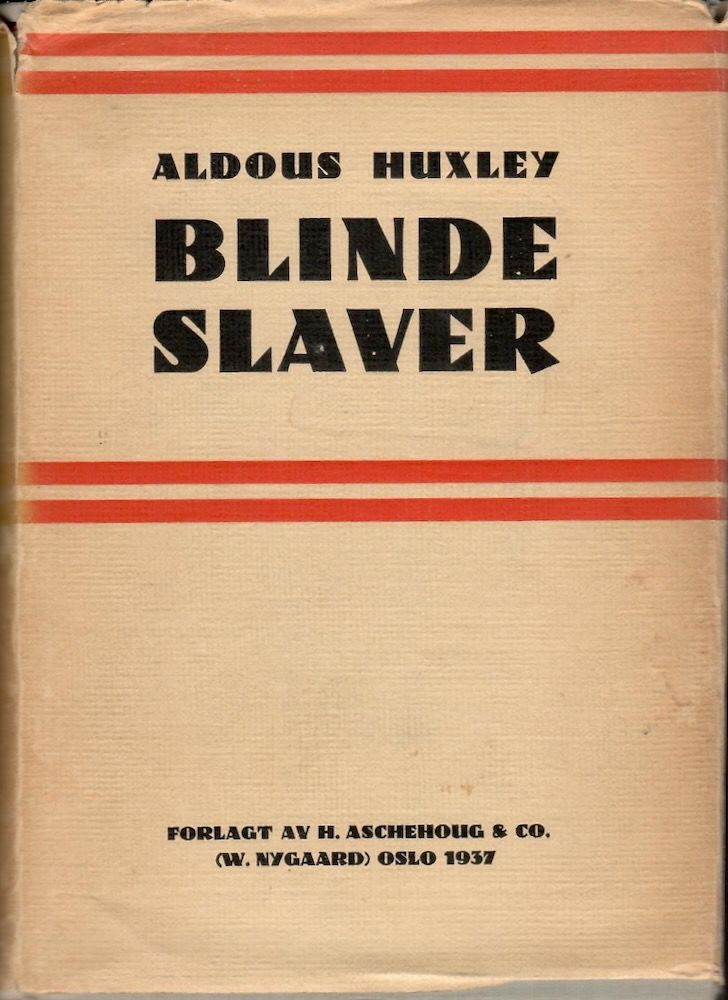 Oslo, 1937. 8vo. 446, (2) s. Originalt helsjirtingbind med vareomslag. Omslaget er noe gulnet med en liten rift. Navn på forsats og noen helt få forsiktige blyantmarkeringer. Pen.. (H. Aschehoug & Co. (W. Nygaard)). Oversatt etter Eyeless in Gaza. Med avisartikkel om Huxley vedlagt.