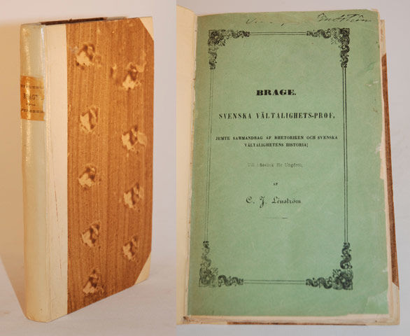 Stockholm; Zacharias Haeggström, 1847. (7) + [lxxii] + 216 s. Senare gulvitt halvklotband med maskinskriven ryggetikett och marmorerade pärmpapper. Oskurna snitt. Främre omslaget medbundet. Gustaf Berndtssons exlibris. Ett svagt rött streck på främre pärmens klot, etiketten med liten marginalförlust. Främre omslaget med en halvt bortskrapad namnteckning och lagade revor. Bra inlaga med enstaka obetydliga fläckar och några små hörnveck. 6 blad med ett litet hål i nedre marginalen. Innehåller texterna: ""Rhetorik, eller Vältalighetslära"", ""Om anordning och bearbetning"", ""Om uttrycket. Sats och stil, troper och figurer"", ""Om declamation"", samt ""Blick på svenska vältalighetens historia"", följda av drygt 60 retoriska exempel från Lagman Torgny till Israel Hwasser.