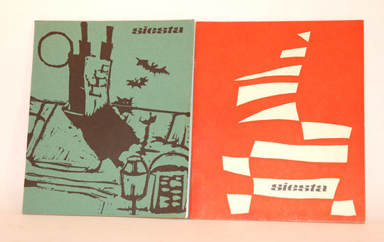 Uppsala, 1956. [181x155 mm]. 63, (1) & 63, (1) s. Illustrerade. Häftade med tryckta omslag. Omslag av Karl Gunnar Rundgren. Ett par omslagshörn obetydligt nötta. Mycket fina ex. Dessa två nummer är allt som utkom av tidskriften. I inledningen till det första numret skriver Gösta Forsman bl. a.: ""Siesta lägger vikt vid att vara en protest av kraftigaste slag mot den dådlöshet, allmänna förflackning och tilltagande likriktning, som tycks känneteckna inte minst de unga. Vi bakom Siesta, och dit räknar vi gärna huvudparten av folk med vakna och känsligt registrerande sinnen, anser att vår värdighet som människor sättes i farozonen från den stund fasta värdenormer tenderar att realiseras som dåliga värdepapper. [...] Denna tidskrift tar sig det orådet före att öppna spalterna för originella och 'oförstådda' debutanter och för verk av äldre författare, som fallit i oförtjänt glömska. Det är oss också en stor ära att få introducera olika illustratörer och skämttecknare."" Här debuterar bl. a. Percy Backlund och Lars Gustafsson. Sara Lidman bidrar med noveller ""Lycka i guds händer"", dikter av Erik Beckman, Ivo Iliste m. fl. och översättningar av Kenneth Rexroth, Wallace Stevens och Charles Baudelaire.