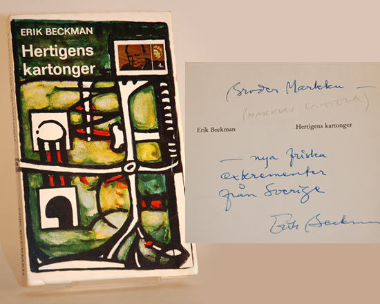 Stockholm; Bonniers, 1965. Originalupplaga. [19,5x12 cm]. 187, (2, 1 blank) s. Häftad. Omslag av Atti Johansson. Mestadels ouppskuren. Ryggen med några lätta skrynklor och fläckar. Vikmärke på bakre omslag. Bra exemplar av författarens tredje bok. Dedikation: ""Broder Markku -- / -- nya friska exkrementer från Sverige / Erik Beckman"". Med ett bilagt postkvitto. Mottagaren Markku Lahtela (1936-1980) var en finländsk författare och fredsaktivist.