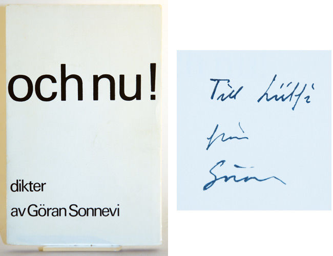 Stockholm; Bonniers, 1967. First edition. 8:o. 48, (3, 5 blanks) pp. Original printed wrappers.Two short tears in rear cover. Pp. 16/17 darkened by an inlaid cutting (newspaper publication of the author's poem on the Vietnam Easter Offensive of 1972). The Swedish poet Göran Sonnevi was from his debut in 1961 perceived as an introvert poet, but from 1965, after the publication of his first poem on the Vietnam War, his role has become increasingly political. His engagement in the order of things is deeply felt through this collection, entitled ""And Now!"". Inscribed to the poet and photographer Lütfi Özkök: ""Till Lütfi / från Göran"".