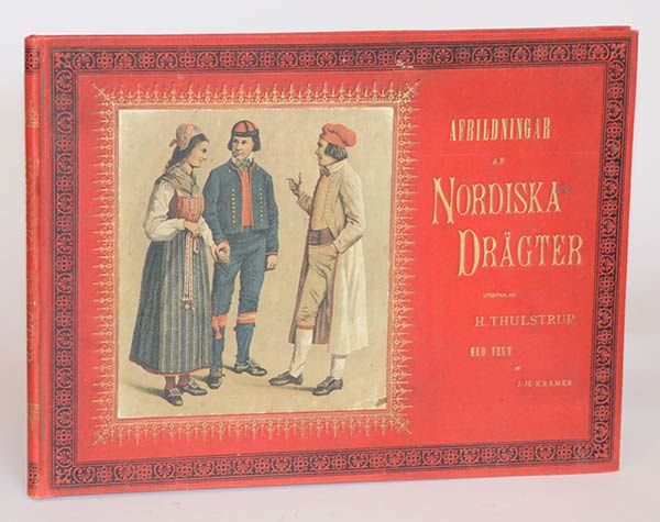 Stockholm; P. B. Eklundhs förlag, 1895. 26,5x35 cm. Unpaginated. (30, 2 blanks) pp. of text + 14 lithographed colour plates. Publisher's red cloth, decorated in black and gold, and with a mounted plate on front board. Spine ends and corners are a trifle bumped, and there are a few light stains on the boards. The mounted plate on front board is a bit rubbed at corners. Most plates have a few light stains and/or fingerprints in margins. Third edition of this work, originally published 1886-1889, displaying Swedish folk costumes of 14 regions, with explaining texts in Swedish and French.