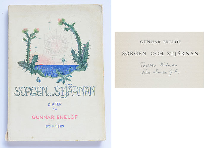 Stockholm; Bonniers, 1936. First edition. 24x16,5 cm. 130 pp. Original wrappers, with a cover vignette by Bertil Bull Hedlund. The spine is a bit wrinkled and has two small specks and a short tear at top and bottom of front joint. The wrappers are slightly soiled, and the rear one has a few rifts in outer margin. Contents are fine, though there are faint offsetting from laid in newspaper cuttings on three openings; one cutting is preserved. Ekelöf's third collection of poems, in which he moves towards 19th century romanticism and folk song. Inscribed: ""Torsten Billman från vännen G. E."" Torsten Billman (1909-1989), Swedish woodcut artist, book illustrator and fresco painter. In 1942, Billman and the poet Gunnar Ekelöf met through the art dealer Gunnar Hjorthén in Gothenburg, a crucial meeting in Billman’s career as a book illustrator since he had the opportunity to show Ekelöf his copy of Martinson’s 'Nomad', in which he had made sketches throughout in the margins. Ekelöf greatly appreciated his style and also borrowed the book in order to show it to his publisher in Stockholm. Some of the illustrations were printed in the magazine 'Konstrevyn' along with a promoting text by Ekelöf, and the book was published with Billman’s drawings in 1943. An illustrated edition of Ekelöf’s poems was also planned, but for unknown reasons this was never carried out. Ekner 3601.