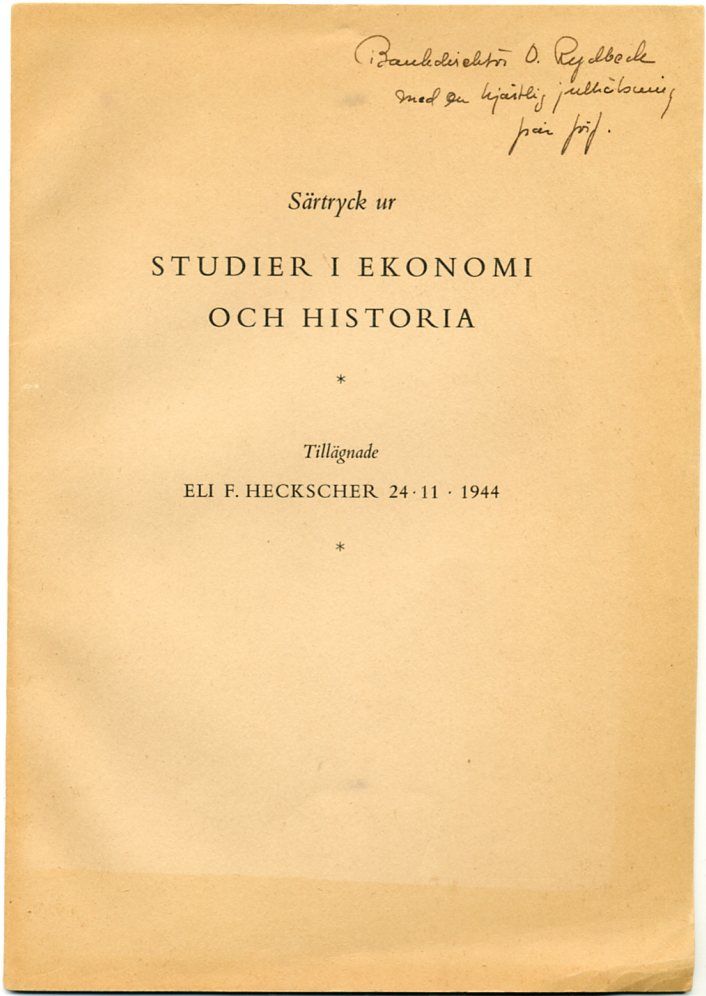 Uppsala, 1944. 26x18,5 cm. 73-88 s. Häftad med tryckt omslag. Omslaget delvis lätt mörknat samt med några små veck. Svesgt genomgående veck i yttermarginalen. Dedikation: ""Bankdirektör O. Rydbeck med en hjärtlig julhälsning från förf."" Bankmannen Oscar Rydbeck (1878-1951) var bl. a. VD för Skandinaviska Kreditaktiebolaget och hade en central position inom svenskt bankväsende under första världskriget och under mellankrigstiden.