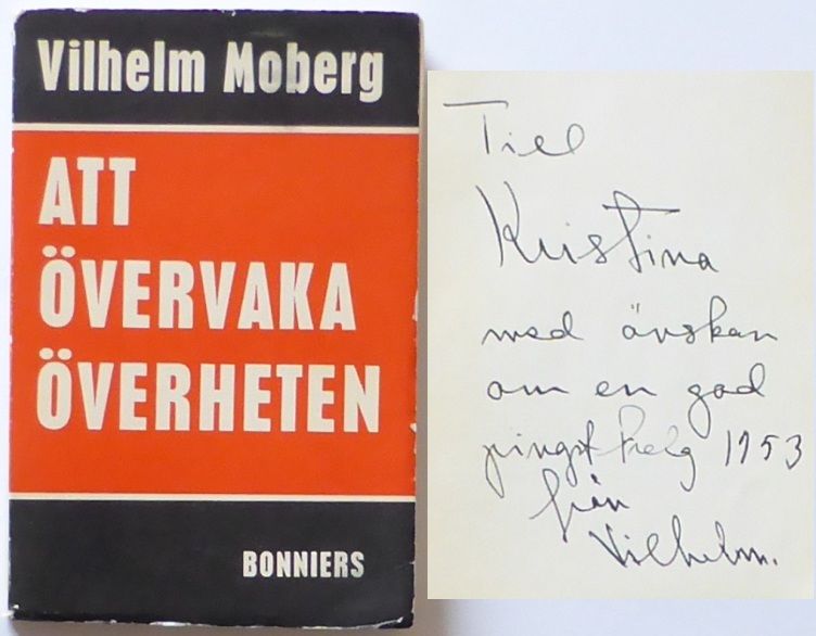 Stockholm; Bonniers, 1953. Originalupplaga. 19,5x13 cm. 190, (2) s. Häftad med tryckt omslag. Ryggen delvis loss i limningen. Främre omslaget med aningen nötta omslagskanter. Liten förlagsstämpel på sista blanka sidan. Bra inlaga. Dedikation: ""Till Kristina med önskan om en god pingsthelg 1953 från Vilhelm"". Mottagaren Kristina Odelberg/Hedenblad (1917-2005) hade under 40-talet och möjligen även senare en kärleksaffär med Moberg, som döpte Kristina i Utvandrarserien efter henne. Kärleksaffären upptäcktes via en svit om 30 böcker som Moberg dedicerat till henne. I exemplaret av Utvandrarna (1949) skriver han: ”Till Kristina, min älskade, som lånat sitt namn åt den kvinnliga huvudpersonen i denna bok, med tacksamhet och kärlek från Författaren”, ett intyg som upprepas så sent som 1969 i pocketupplagan av Utvandrarserien: ” Den 29/3 1969. / Till Kristina -- hon som givit sitt namn åt den kvinnliga huvudpersonen i utvandrarromanen och till Minnet / med innerlig tillgivenhet från Författaren”, vilket visar att hon var fullt närvarande i hans tankevärld under hela denna tid och därmed mycket väl kan ha påverkat hans senare litterära produktion. Vad som ytterligare talar för detta är exemplaret av Vår ofödde son, en pjäs från 1945 som behandlar abort-problematik. Detta är den enda av böckerna som Kristina låtit binda in i ett påkostat rött skinnband, med en pärmficka längst bak där hon samlat tidningsartiklar om boken och dess författare. I Kristinas exemplar av den danska utgåvan av samma bok, utgiven 1947, finns en dedikation från översättaren: ”Kaera Kristina! / Denne Bog, den til Dels handler om dig, sendes dig til Erindring -- ikke om Forfattaren, men om Oversatteren. / Din Carl Erik"".
