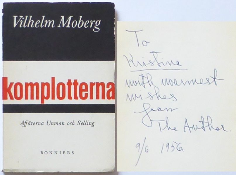 Stockholm; Bonniers, 1956. Originalupplaga. 19,5x13 cm. 59, (1) s. Häftad med tryckt omslag. Riss vid ryggfoten. Främre omslaget med lätt nötta kanter. Bakre omslag med två riss i yttermarginalen. Bra inlaga. Dedikation: ""To Kristina with warmest wishes from the Author / 9/6 1956."" Mottagaren Kristina Odelberg/Hedenblad (1917-2005) hade under 40-talet och möjligen även senare en kärleksaffär med Moberg, som döpte Kristina i Utvandrarserien efter henne. Kärleksaffären upptäcktes via en svit om 30 böcker som Moberg dedicerat till henne. I exemplaret av Utvandrarna (1949) skriver han: ”Till Kristina, min älskade, som lånat sitt namn åt den kvinnliga huvudpersonen i denna bok, med tacksamhet och kärlek från Författaren”, ett intyg som upprepas så sent som 1969 i pocketupplagan av Utvandrarserien: ” Den 29/3 1969. / Till Kristina -- hon som givit sitt namn åt den kvinnliga huvudpersonen i utvandrarromanen och till Minnet / med innerlig tillgivenhet från Författaren”, vilket visar att hon var fullt närvarande i hans tankevärld under hela denna tid och därmed mycket väl kan ha påverkat hans senare litterära produktion. Vad som ytterligare talar för detta är exemplaret av Vår ofödde son, en pjäs från 1945 som behandlar abort-problematik. Detta är den enda av böckerna som Kristina låtit binda in i ett påkostat rött skinnband, med en pärmficka längst bak där hon samlat tidningsartiklar om boken och dess författare. I Kristinas exemplar av den danska utgåvan av samma bok, utgiven 1947, finns en dedikation från översättaren: ”Kaera Kristina! / Denne Bog, den til Dels handler om dig, sendes dig til Erindring -- ikke om Forfattaren, men om Oversatteren. / Din Carl Erik"".
