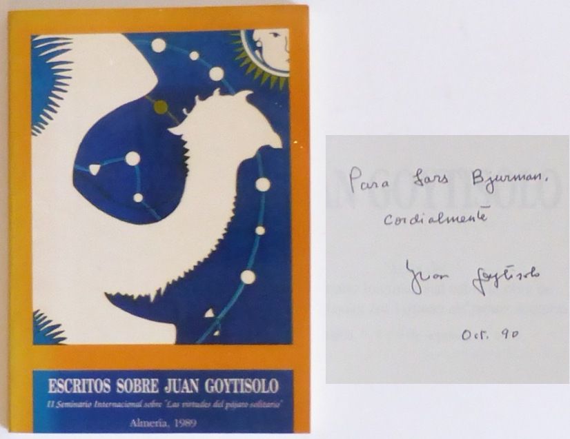 Almería; Instituto de Estudios Almerienses, 1990. 24x17 cm. 236, (1, 1 blank) pp. Original printed wrappers. Spine is slightly faded. Top corner of the wrappers andmost leaves have a light folding mark, otherwise fine. There are small pencil markings in margins on a few pages, and some pencil notes on the last blank leaf. Inscribed by Goytisolo: ""Para Lars Bjurman, cordialmente / Juan Goytisolo / Oct. 90"". Lars Bjurman (1932-2008), Swedish author and translator. He translated Goytisolo's 'Las virtudes del pájaro solitario' into Swedish, published in 1992 as 'Den ensamma fågelns dygder'.