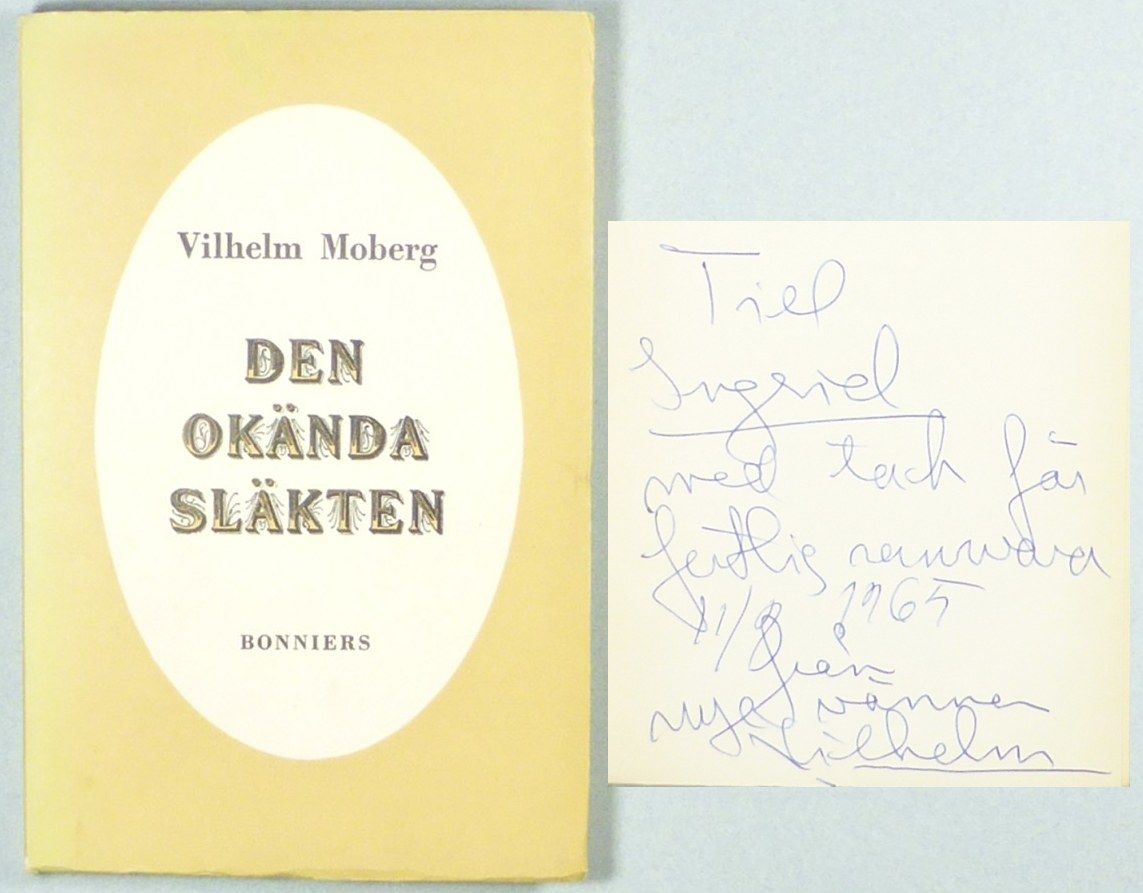 Stockholm; Bonniers, 1950. Originalupplaga. 19,5x13 cm. 138, (2, 2 blanka) s. Häftad med tryckt omslag. Ouppskuren. Ryggen blekt och med en liten mörk prick, främre omslagets innermarginal är lätt blekt. Svaga fläckar på rygg och bakre omslag. Det överdimensionerade omslaget är lätt veckat i nedre marginalerna. Moberg skrev denna bok medan han gjorde efterforskningar inför arbetet på Utvandrarserien, och den innehåller bl. a. kapitlen ""Hur amerikalegenden skapades i Sverige"", ""Svensk kyrkogård i Amerika"" och ""Vad vet svenskarna i Sverige och Amerika om varandra?"" Dedikation: ""Till Ingrid med tack för festlig samvaro 11/[?] 1965 från nye vännen Vilhelm"".