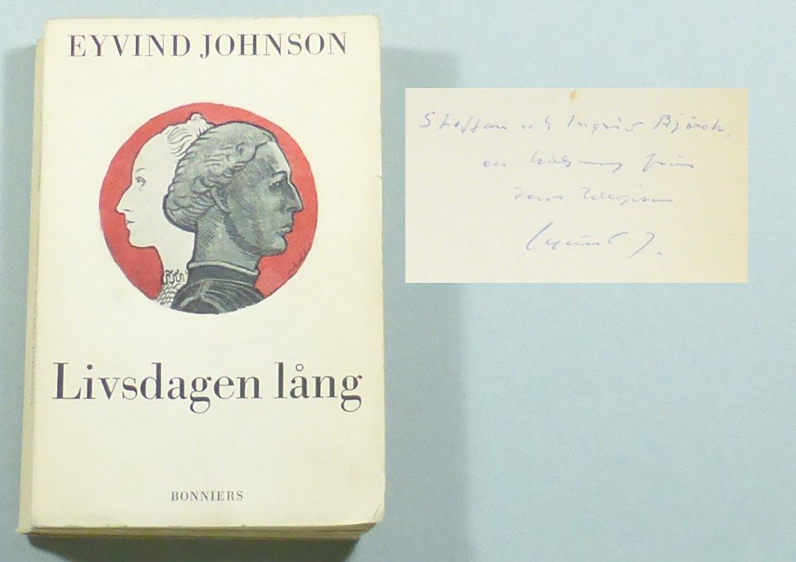 Stockholm; Bonniers, 1964. Originalupplaga. 19,5x13 cm. 329, (4, 1 blank) s. Häftad med omslagsvinjett av Roland Svensson. Lätt snedläst. Det överdimensionerade omslaget är lätt veckat i nedre marginalerna. Aningen solkat omslag; det främre med ett riss i yttermarginalen. S. 198-199 något gulnade av ilagda tidningsurklipp (fyra recensioner av romanen, bl. a. av Artur Lundkvist). Spridda svaga blyertsmarkeringar i texten, samt några anteckningar på sista sidan. Romanens stomme är ett samtal mellan Berättaren och Historikern under ett antal kvällar i Rom där ett antal fall av olycklig kärlek, från 800-talet och framåt, skildras. Flertalet bedömare av den svårtydda romanen har beskrivit den som en hybrid av roman, essä och självbiografi. Dedikation: ""Staffan och Ingrid Björck, en hälsning från deras tillgivne Eyvind J."" Staffan Björck (1915-1995), professor i litteraturvetenskap.