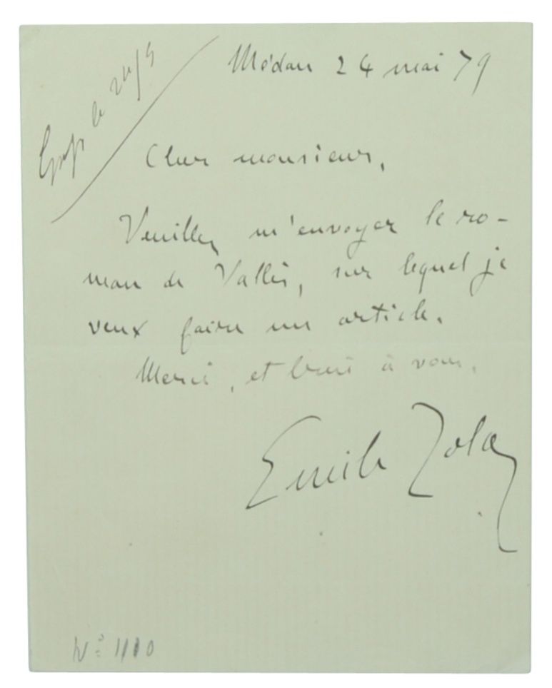 13,5x10,5 cm. Seven lines. Letter in Zola's handwriting, dated ""Médan 24 mai 79"", and signed by the author. In this short letter Zola asks the unnamed recipient, probably his publisher, to send him the novel by Vallès, on which he plans to write an article. The mentioned novel is apparently the newly-published L'Enfant, the first novel in the autobiographical trilogy by Zola's friend Jules Vallès (1833-1885), French novelist and journalist.