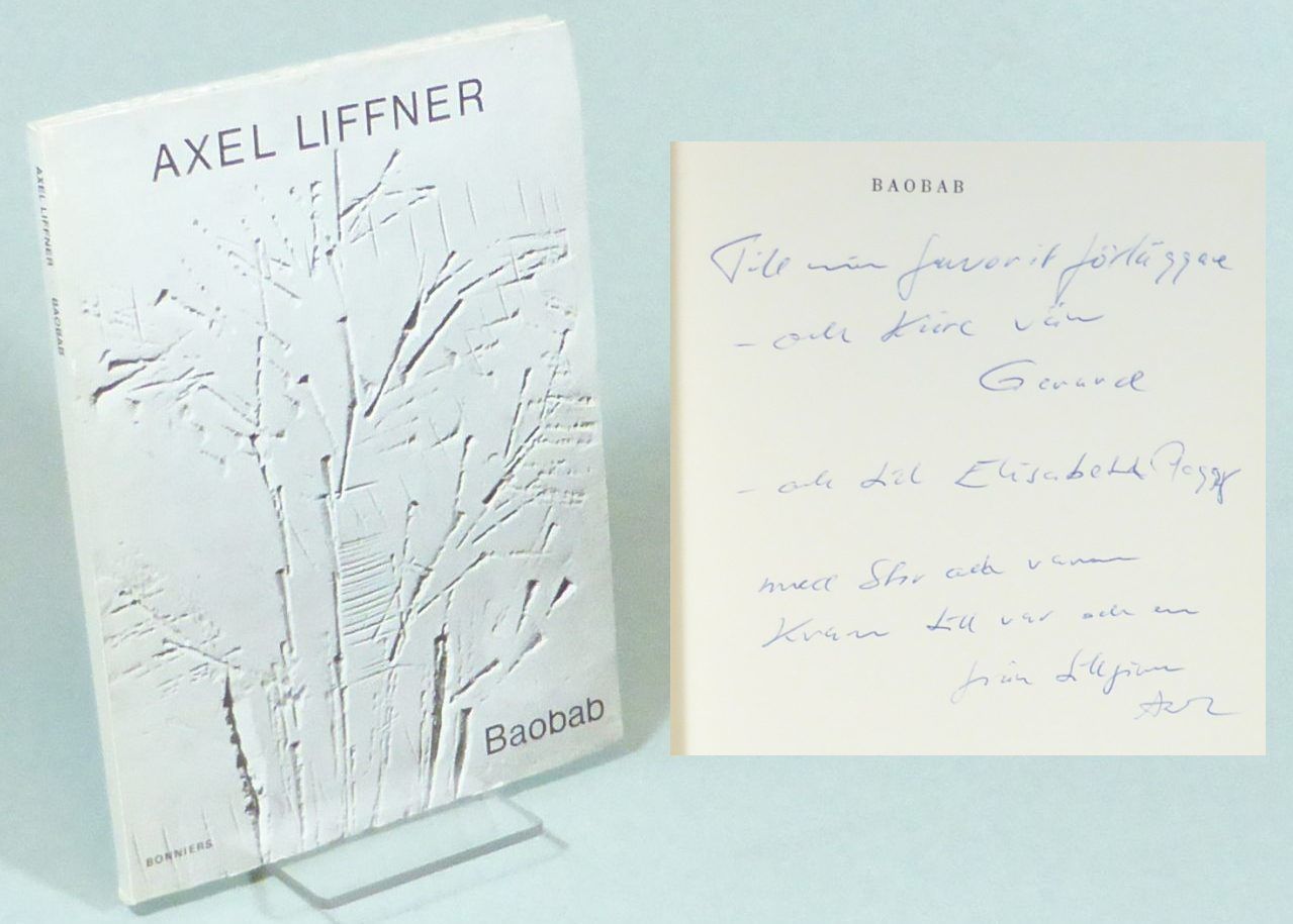 Stockholm; Bonniers, 1975. Originalupplaga. 18x13,5 cm. 48, (3, 1 blank) s. Häftad med omslag av Arne Jones. Det överdimensionerade omslaget är aningen veckat i nedre marginalerna samt övre hörnen. Dedikation: ""Till min favoritförläggare -- och käre vän Gerard [Bonnier] -- och till Elisabeth Peggy / med stor och varm kram till var och en / från tillgivne Axel"".
