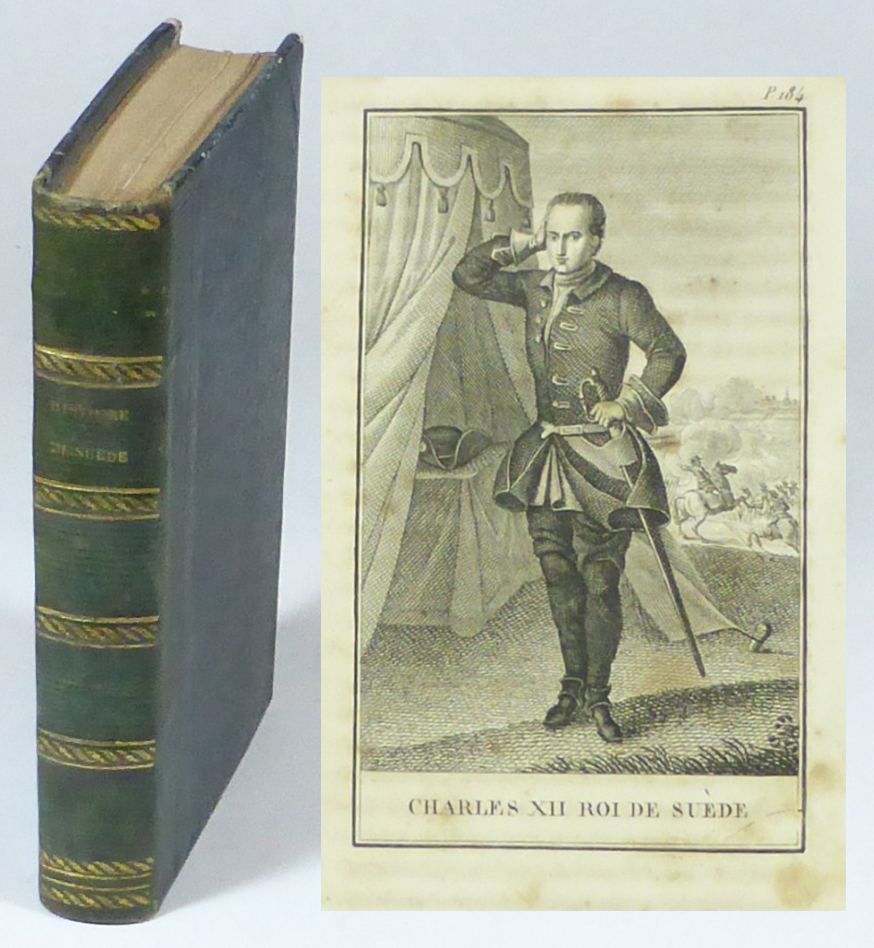 Paris; Le Prieur, 1817. 12:mo. 17,5x10,5 cm. (3, 1 blank), 339, (1 blank) pp. + 8 engravings. Contemporary green halr leather with raised bands and gilt borders on spine, green paper on boards, marbled endpapers. Spine ends are slightly worn. Owner stamp (C. Canuel) on pp. 1 and 336. Contents are a bit stained, and there are a few cornerfolds. There is a short tear in outer margin on pp. 73/74, a small hole and a tear in outer margin on pp. 81/82, and a small cornerloss on pp. 263/264. Nice copy of this collection of anecdotes from the history of Sweden.