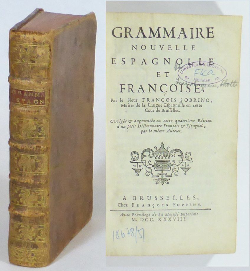 Brussels; François Foppens, 1738. Fourth, revised edition. 8:o. 16,5x10,5 cm. (10, 2 blanks), 461, (1) pp. Contemporary full leather, spine with raised bands and gilt decorations in compartments, sprinkled red edges. Early owner's undeciphered signature on front free endpaper. Library stamp on the French title leaf, along with a few small pen notes. Spine and corners are moderately worn. The boards are a little bowed. Recurrung faint dampstain in lower margin and lower corner, and a few scattered small specks. A fine copy.
