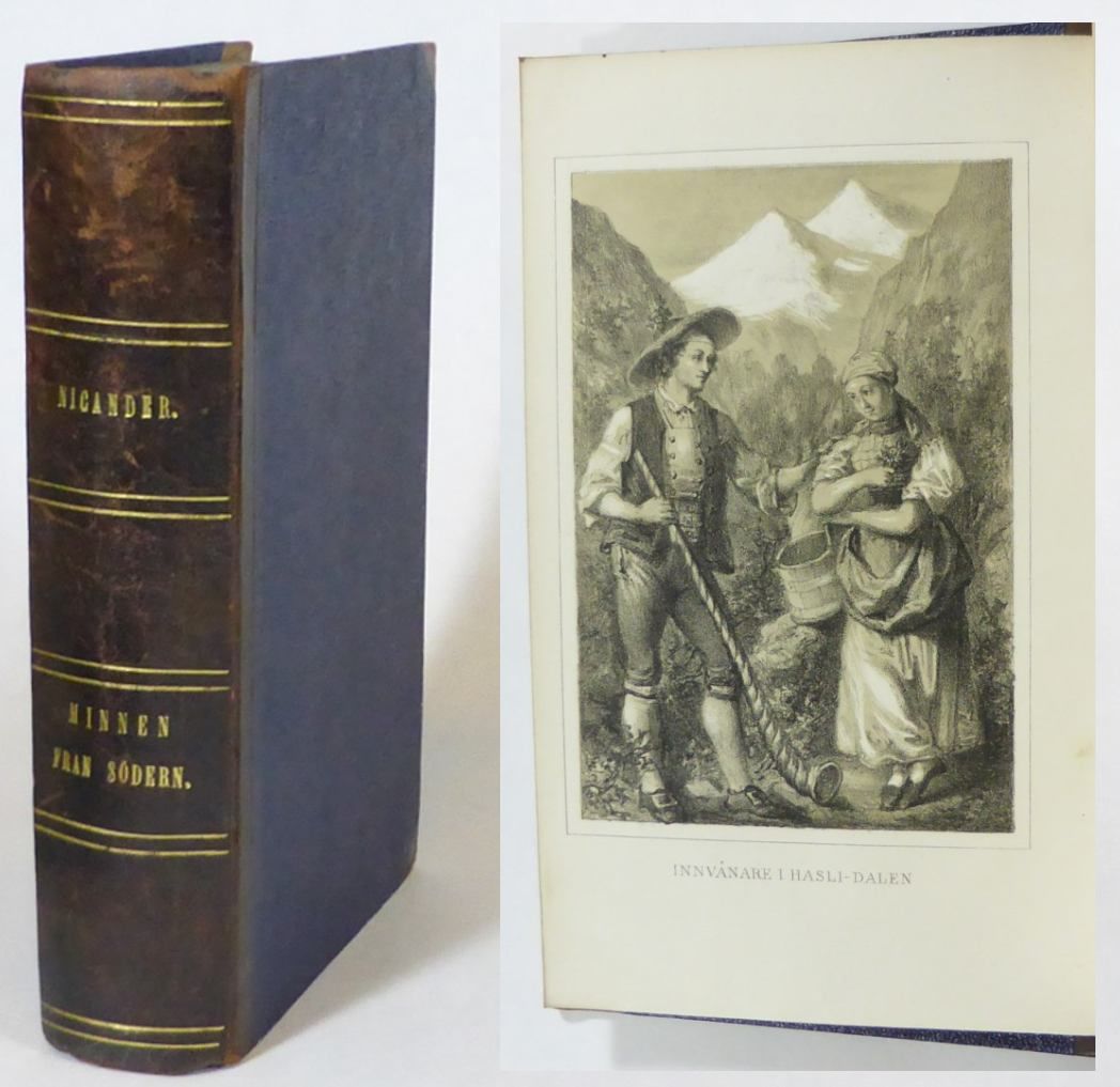 Örebro; N. M. Lindh, 1862-1863. 21x13,5 cm. viii, (3, 1 blank), 287, (1) s. & viii, 385, (1 blank) s. + 2 litograferade planscher. Samtida mörkbrunt halvfranskt band med förgylld ryggtitel och mörkblå pärmpapper, stänkmålade snitt. Rygghuvudet något tilltryckt, rygg och pärmhörn lätt nötta. s. 225-242 lätt fläckade i nedre marginalen, samt ett fåtal spridda småfläckar. S. 249-306 med ett litet veck invid övre hörnet. Ovanligt ren och snygg inlaga. Andra upplagan av verket, som ursprungligen gavs ut 1831-1839. Nicander vistades i Italien 1827-29. Han fick medel att göra resan efter ett skaldebrev till kronprinsen, som förväntade sig att hans utomlandsvistelse skulle avsätta sig i dramatisk produktion. Andra delen publicerades posthumt av G. H. Mellin, som skrivit ett kort förord.