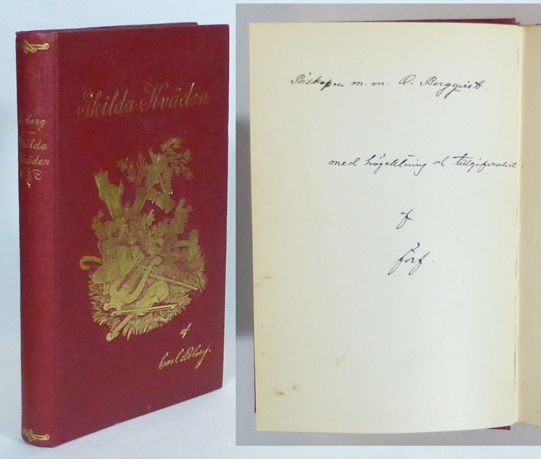 Stockholm; Sanningsvittnets Förlagsexpedition, 1913. Originalupplaga. 19,5x13,5 cm. 245, (5) s. Förlagets röda dekorerade klotband med mönstrade försättsblad. Rygghuvudet aningen tilltryckt. Övre snittet lätt fläckat. Några små fläckar på främre försättsblad samt motstående halvtitelblad. Fint ex. Innehåller avdelningarna ""Skilda kväden"" och ""Religiösa sånger"". Boberg (1859-1940), predikant, riksdagsman och som författare främst ihågkommen för sina psalmer, i synnerhet den 1885 författade ""O store Gud"" (vilken gör honom till den ende svenske författare som blivit sjungen av Elvis Presley, ""How Great Thou Art""). Dedikation: Biskopen m. m. O. Bergqvist med högaktning och tillgifvenhet af förf."" Mottagaren Olof Bergqvist (1862-1940) var Luleå stifts förste biskop åren 1904-1938.