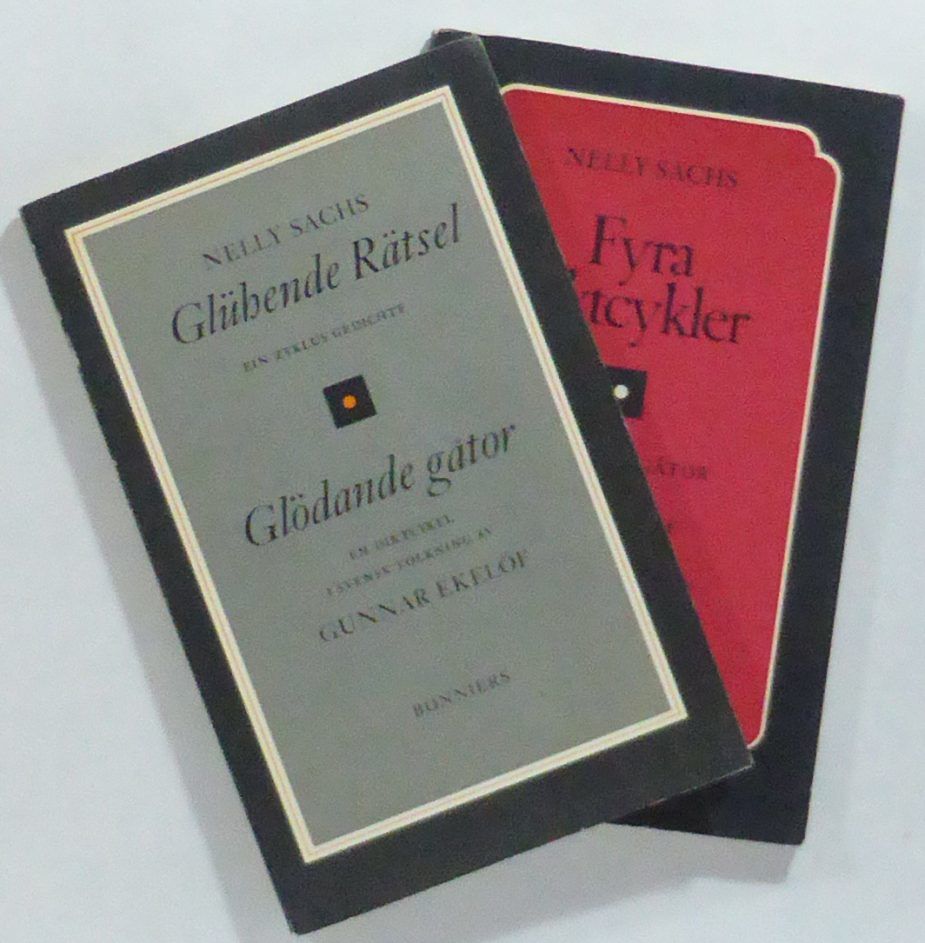 Stockholm; Bonniers, 1966 & 1970. 21x13,5 resp. 21x13,5 cm. 67, (1) & 72, (2, 2 blanka) s. Två häftade volymer med tryckta omslag. Aningen nötta ryggar. Första volymen med aningen sokat bakre omslag. Andra volymen med minimal hörnförlust upptill på det sista tryckta bladet. Med ett efterord av Ekelöf i första volymen, som omfattar de 30 korta dikter som utgör första delen av ""Glühende Rätsel"" (först tryckta i ""Ausgewählte Gedichte"" (1963). Med tysk och svensk parallelltext. Andra volymen innehåller fortsättningen av cykeln ""Glühende Rätsel"" (Frankfurt, 1968) samt Den sökande (originaltitel: Die Suchende, Frankfurt 1966). Första svenska utgåvan för båda arbeten.