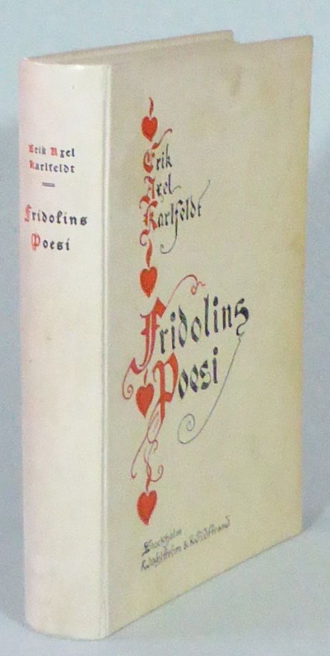 Stockholm; Wahlström & Widstrand, 1914. 22x16 cm. Fotoplansch, (7, 1 blank), 260 s. Förlagets pergamentband med titeln i rött och svart bläck på rygg och främre pärm. Några små mörka prickar på ryggen. Främre pärmen aningen bågnad samt lätt solkad. Fint ex. Begränsad praktupplaga utgiven till Karlfeldts 50-årsdag. Pärmdekoren komponerades av Albert Engström.
