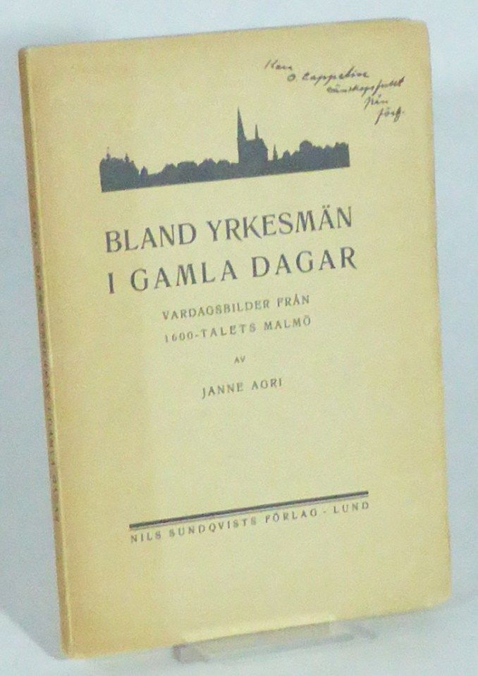 Lund; Nils Sundqvists Förlag, 1930. 23x15,5 cm. 165, (1, 2 blanka) s. Illustrerad. Häftad med tryckt omslag. Rygg och omslag delvis mörknade, ryggen även med en serie svaga fuktringar. Främre omslag med liten hörnförlust nedtill. Kort reva i tre av falsarna. Fin inlaga. Innehåller bl. a. kapitlen ""Malmö badare och koppsättare"", ""Malmö stadskockar"", ""En skånsk skarprättarfamilj"". Med en dedikation från författaren till Ola Cappelin på främre omslag, samt med mottagarens namnteckning på titelbladet och hans dubblettstämpel på främre omslagets insida, följd av en stämpel för Skånes Hembygdsförbund, Lund.