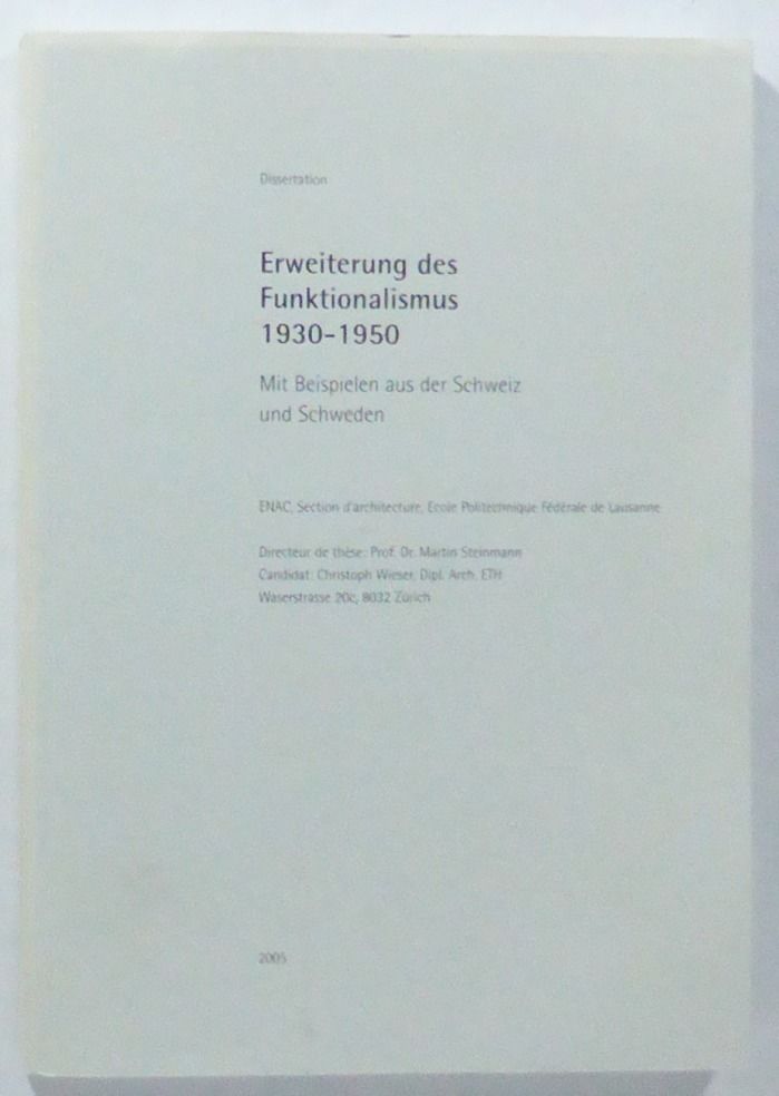 Lausanne; École Polytechnique Fédérale, 2005. Diss. 29,5x20,5 cm. 288 pp. Illustrated. Original printed wrappers. Front wrapper is slightly faded in the top and inner margins, and has an insignificant stain in lower margin. A fine copy. ""Der Funktionalismus dient als Leitbegriff dieser Arbeit, anhand dessen die Veränderungen der modernen Architektur von 1930 bis 1950 nachgezeichnet werden sollen. Diese Wahl liegt nahe, weil sich der Funktionalismus gerade wegen seiner Radikalität als Gradmesser zur Beschreibung des Zustandes der modernen Architektur eignet. Denn er verkörpert in seiner allgemein bekannten Form die engste Stelle einer Entwicklung, die um 1920 vielgestaltig beginnt, sich dann immer stärker fokussiert, um sich schliesslich anfangs der 30er-Jahre wieder auszuweiten. Das Vordringen zum - Kern des Funktionalismus erweist sich jedoch als schwierig, weshalb zunächst die verwandten Begriffe untersucht werden: die Sachlichkeit, respektive die Neue Sachlichkeit, das Neue Bauen, der Rationalismus und als Exkurs, der italienische Razionalismo. Anschliessend wird der Versuch unternommen, den Funktionalismus zu definieren. Im Unterschied zur gängigen Rezeption, wird er nicht mit dem hier als ""dogmatischer Funktionalismus"" bezeichneten Zustand Ende der 20er-Jahre gleichgesetzt, sondern in einem umfassenderen Sinn verstanden - was im Begriff der Funktion bereits angelegt ist, damals und in der anschliessenden Rezeption aber oft ausgeblendet wird. - - Dieses erweiterte Funktionalismusverständnis bildet die Grundlage zur Analyse der Erweiterungsphase, die in drei Abschnitte unterteilt werden kann. Dabei verweisen die hier eingeführten Begriffe - ""aufgeklärter Funktionalismus"" für die Jahre von 1930 bis 1935, ""selbstverständlicher Funktionalismus"" für den folgenden Abschnitt bis Kriegsende sowie ""unterschwelliger Funktionalismus"" für die ersten Nachkriegsjahre bis 1950 - auf die Art der Entwicklung: Der Funktionalismus verliert zusehends an Radikalität und wandelt sich zu einer undogmatischen, breit akzeptierten modernen Baukultur. Gegen 1950 wird die funktionalistische Methodik aber immer häufiger mit - einer traditionellen Formensprache kombiniert, wodurch sich die Konturen der funktionalistischen Ästhetik immer stärker auflösen. Damit ist die letzte Erweiterungsstufe erreicht."" (Preface).