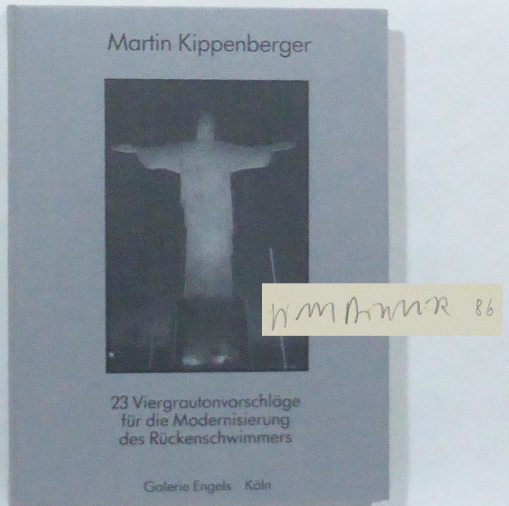 Köln; Galerie Engels, 1986. 26x20 cm. 35 leaves, printed on the recto. Original grey linen, printed in black on front board. A fine copy. Contains the text ""Carioca sein"" by Kippenberger and Albert Oehlen, and 23 plates in silkscreen. One of 75 issued copies. ""23 Four-grey-tone-proposals for the Modernization of the Backstroke Swimmer"", referring to the statue Christ the Redeemer in Rio de Janeiro, was published to accompany the exhibition at Galerie Engels. Signed by Kippenberger in pencil. Koch, Annotated catalogue raisonné of the books by Martin Kippenberger 1977-1997, no. 32. From the library of Anders Tornberg Gallery in Lund, Sweden, and with a stamp confirming this on the last blank page.