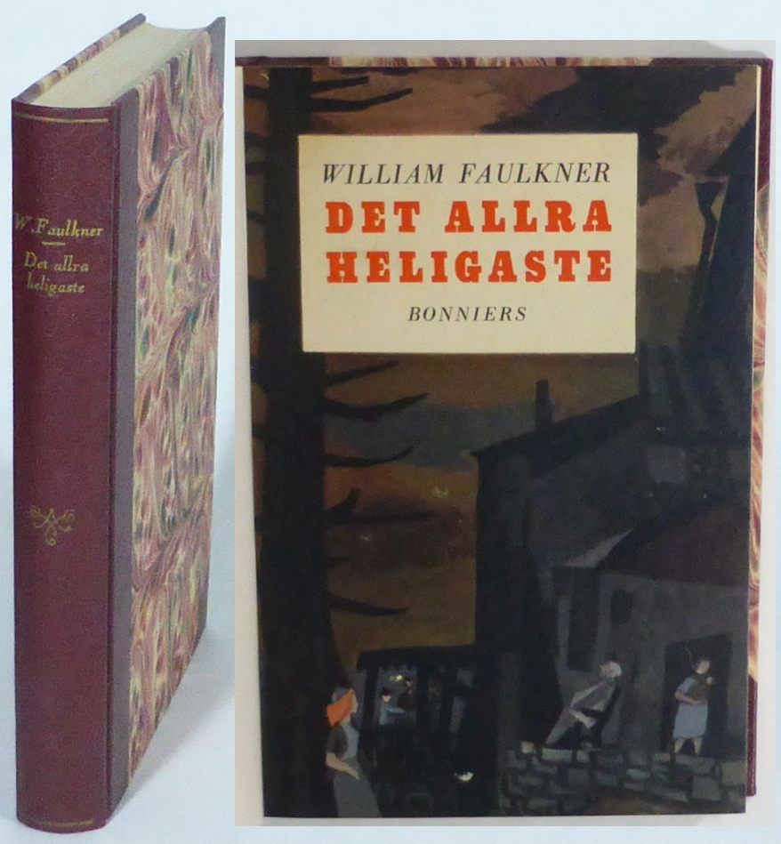 Stockholm; Bonniers, 1951. Originalets titel: Sanctuary (New York, 1931). Översättning av Mårten Edlund. 22,5x15,5 cm. 236, (1, 1 blank) s. Osignerat rött halvklotband med förgylld ryggtitel och marmorerade pärmpapper. Främre omslaget medbundet. Namnteckning (Lars Norrlid) på halvtitelbladet. Fint ex. Första svenska utgåvan. ""It concerns a group of social misfits, chief among whom are Temple Drake, the daughter of a judge, and Popeye, a Memphis hoodlum, and the drama is played out against the background of the degenerating society of Frenchman's Bend in Faulkner's fictional Yoknapatawpha County, Mississippi... Moral authority is embodied in the character of the lawyer, Horace Benbow, who finds his idealism and his belief in human reason defeated by what one critic calls 'the horrifying power of evil' which the novel depicts."" (The Oxford Companion to Twentieth-Century Literature in English). Enligt författaren ""the most horrific tale I could imagine"". Romanen skrevs före ""As I Lay Dying"" (1930) och existerar i två olika versioner; den refuserade och omskrivna som publicerades 1931, samt den ursprungliga versionen som gavs ut först 1981. Unsigned red half cloth with gilt title on spine and marbled boards. Front wrapper is preserved. Previous owner's name on the half-title. A fine copy of the first Swedish edition of ""Sanctuary"".