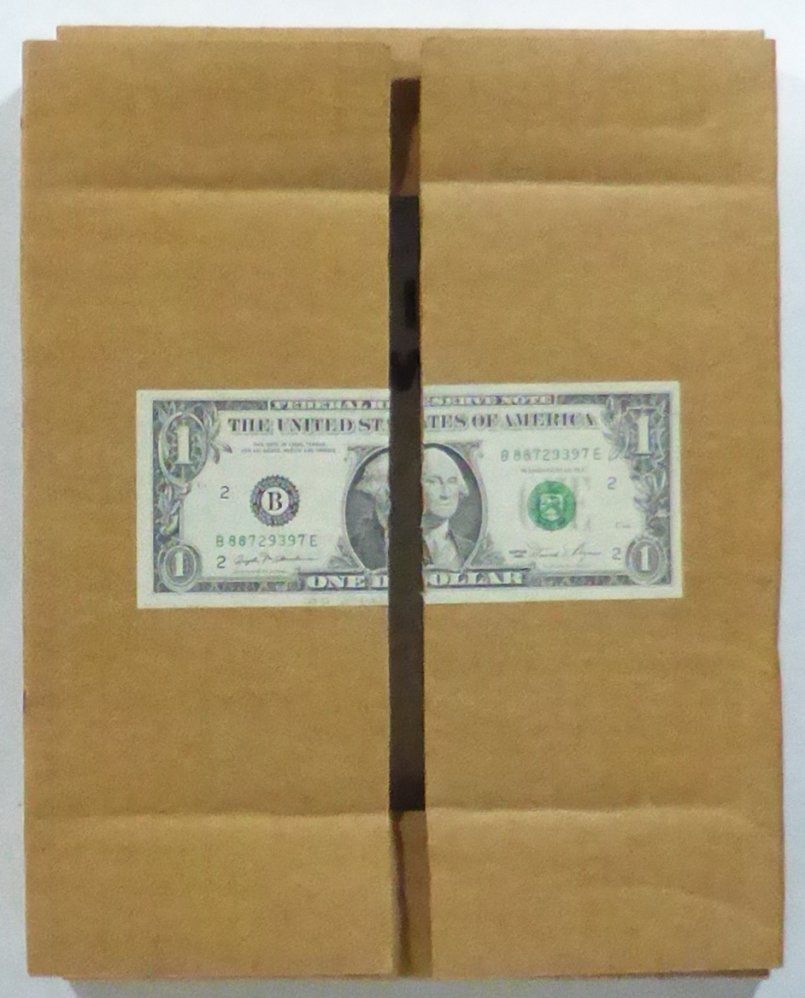 New York; Exit Art, 1982. 28x21,5 cm. 27 folded sheets in a brown cardboard box. The box has been sealed with a dollar bill, and has been opened. There is a small crack in onr of the foldings. A fine copy. Published on the occasion of Exit Art's first event, a group exhibition at Franklin Furnace in New York. The exhibiting artists were Vito Acconci, Gempei, Akasegawa, Louis Aragon, Scott Billingsley, Marc Blane, Gunther Brus, Barry Bryant, Chris Burden, Papo Colo, Bogomir Ecker, William Farley, John Fekner, Lou Forgione, John Giorno, John Halpern Gaag, Abbie Hoffman, Sam Hsieh, Jay Jaroslov, Komar & Melamid, George Maciunas, Gordon Matta-Clark, Ann Messner, Richard Mock, Peter Monnig, Charlotte Moorman, Otto Muehl, Hermann Nitsch, Dennis Oppenheim, Peoples Flag Show, Jan Van Ray, and Real Estate Show. ""The show explored the ways in which the practice of art had occasionally run afoul of the law, from Charlotte Moorman playing cello in the nude to Chris Burden ordering his assistant to shoot him in his arm. The catalogue consisted of a series of artists’ statements housed in a box, which was sealed shut. In order to open it, you had to tear through a dollar bill glued across the flaps—an illegal act, albeit of the mildest kind."" (Hua Hsu, ""Exit Art 1982-2012"", in The Paris Review, April 12, 2012). From the library of Anders Tornberg Gallery in Lund, Sweden, and with a stamp confirming this on inside of the box.