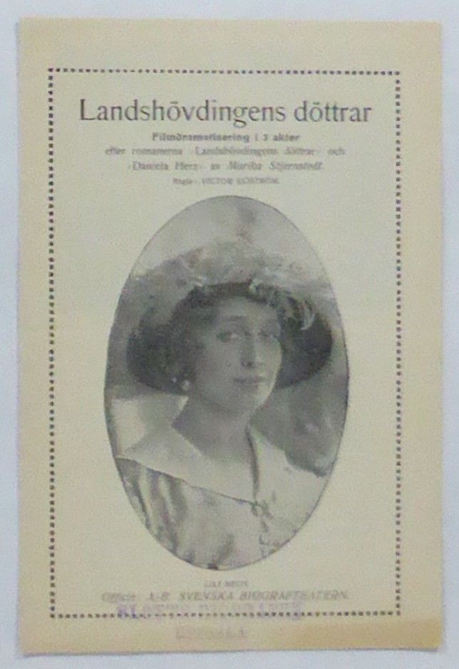 Stockholm; AB Svenska Biografteatern, 1915. 19,5x13 cm. (8) s. Illustrerad med bilder ur filmen. Klammerhäftad. Vikt en gång. ""Slotts-Biografen Uppsala"" stämplat på första sidan, som är aningen mörknad i nedre marginalen. Fint ex. Program för stumfilmen som Stiernstedt själv skrev ett första manus till, vilket liksom filmen är förlorat. Enligt Svensk Filmdatabas blev Stiernstedt troligen den andra svenska kvinnliga författaren som fått ett filmmanus antaget, föregången av Elin Wägner som skrev manus till ""Exkonung Emanuel i Stockholm"" samt ""Systrarna"" (1911 resp. 1912). I filmen sammanförs Landshövding Saltas (Alfred Lundberg) dotter med sin okända halvsyster (båda spelade av Lili Bech) som efter diverse ekonomiska och amorösa förvecklingar, orsakade av bl. a. Löjtnant Pasch (Richard Lund), driver ett barnhem tillsammans.