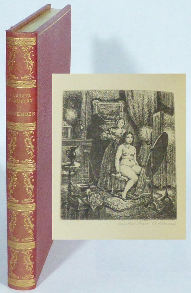 Stockholm; Wahlström & Widstrand, 1946. Originalets titel: Novembre (skriven 1842, publicerad först 1910). 25x20 cm. xi, (1 blank), 143, (2, 1 blank) s. + 3 blad med monterad plansch, samt en signerad originaletsning. Rött skinnband (Victor Petterssons Bokindustri AB) med förgylld ryggdekor, helt guldsnitt, inre denteller och marmorerade försättsblad. Främre häftesomslaget medbundet. Förvarad i en marmorerad pappkassett. Aningen nött kassett. Ryggen lätt blekt. Fint ex. Bibliofilupplagan trycktes på lyxtryckpapper från Finpappersbruken i 200 exemplar, varav detta är nr 47. Flauberts första roman, som han senare refererade till som en ""sentimental ratatouille"", publicerades först posthumt i ""Œuvres de jeunesses inédites"" (1910). Lindgren 145. Ekner, Gunnar Ekelöf. En bibliografi 4602.