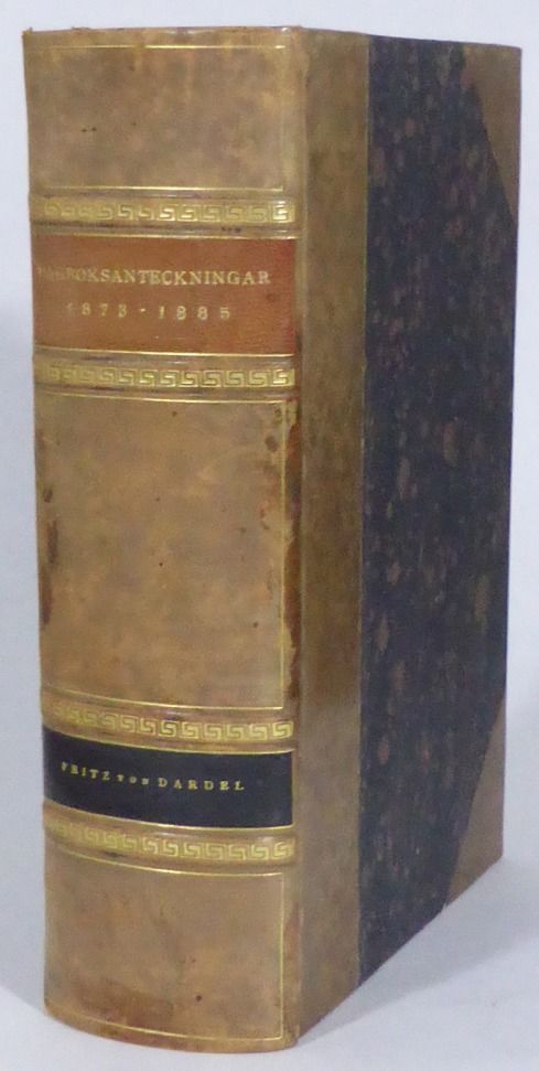 Stockholm; Norstedts, 1916-1920. 25x17,5 cm. Porträttplansch, (6, 2 blanka), 255, (1 blank) & (4, 2 blanka), 236 & (4, 2 blanka), 280 s. Rikt illustrerade. Sammanbundna i ett samtida brunt halvfranskt band (Norstedt & Söners Bokbinderi) med titel- och författaretikett i rött resp. svart skinn, förgylld ryggdekor, marmorerade pärmpapper och försättsblad, övre guldsnitt. Samtliga omslag medbundna. Med Fritzes bokhandels etikett på främre innerpärm. Ryggen lätt flammig samt med några små fläckar. Främre snittet med några fläckar överst som uppstått vid förgyllningen av övre snittet. Fint ex. Fritz von Dardel (1817-1901), Schweizisk-svensk officer och konstnär. Memoarerna omfattar åren 1873-1885 och utgör en fortsättning på författarens ""Minnen"". Verket innehåller många skildringar från hovet från Karl XV:s dagar samt från svensk konstnärsliv. Verket är illustrerat med författarens teckningar, många av dem karikatyrer av personer i hans omgivning. Nr 152 av bibliofilupplagans 300 exemplar.