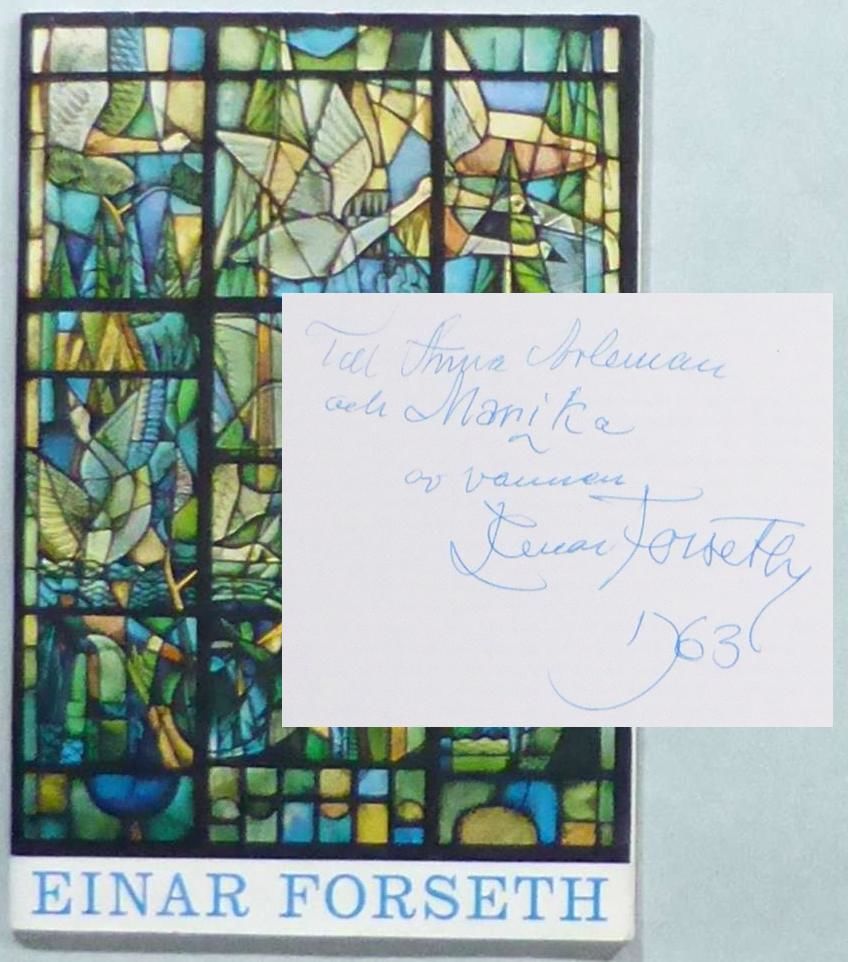 Stockholm, 1963. 25x17 cm. 63, (1) s. Rikt illustrerad. Klammerhäftad med tryckt omslag. Bakre omslaget med ett riss invid rygghuvud resp. ryggfot. Fint ex. Med en essä av Folke Holmér, kronologi samt en förteckning över de 174 utställda verken. Dedikation: ""Till Anna Arleman och Marika av vännen Einar Forseth 1963"". Mottagare var barnboksförfattaren Anna Arleman och hennes dotter, textilkonstnären Marika Arleman-Leander.