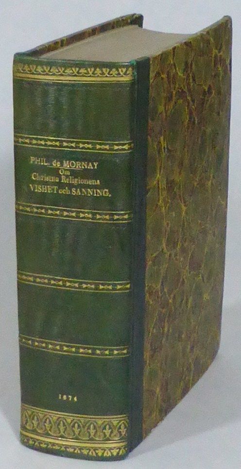 Stockholm; Henrich Keyser, 1674. 4:o. 19,5x15,5 cm. (38), 687, (4, 1 blank) s. Senare osignerat grönt halvklotband med förgylld ryggdekor och marmorerade pärmpapper. Pärmhörnen något nötta. En liten nagg i yttermarginalen på s. 669-674. Endel spridda småfläckar, fingeravtryck och svaga fuktränder. Mycket välbevarat ex. Med Hilding Pleijels exlibris. Första svenska utgåvan av verket. First Swedish edition of Traité de la vérité de la religion chrétienne contre les athées, épicuriens, payens, juifs, mahométans et autres infidèles (Antwerpen, 1581; the Latin version 1579). Bound in later green half cloth with gilt spine decorations and marbled sides. Corners are slightly worn. A minimal chip in top margin of pp. 669-674. A few scattered small stains, fingerprints and faint dampstains. A very well-preserved copy. With the bookplate of Swedish professor of Church History Hilding Pleijel. Collijn, Sveriges bibliografi 1600-talet, 203.