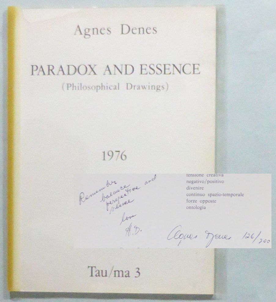 Rome; Tau/ma 3, 1976. First edition. 28,5x21,5 cm. 59, (1 blank) pp. Original printed wrappers with plastic cover. A small loss at top of front panel on the plastic cover, otherwise fine. Contains excerpts from the artist's writings in English and Italian bilingual text. Issued in 200 copies. This is number 126, signed by Denes and additionally inscribed: ""Remember balance / perspective and balance / love / A. D."" From the library of Anders Tornberg Gallery in Lund, Sweden, and with a stamp confirming this on the last blank page.