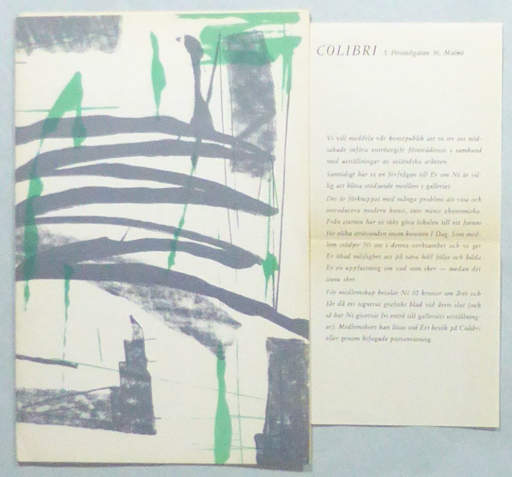 Malmö; Galerie Colibri, 1956. 24x16 cm. (4) s. Inlagan lös i litograferat omslag. Fint ex. Innehåller en inledande text av C. O. Hultén samt kortfattad förteckning över de 32 utställda verken av Bertil Berntsson, Ingvar Engdahl, Lennart Jönsson, Nils Ingwar Nilson och Yngve Sebastian. Med ett löst bilagt tryckt blad där galleriet meddelar att man måste börja med entréavgift vid utställningar. Proveniens: Ingemar och Mikaela Leckius.