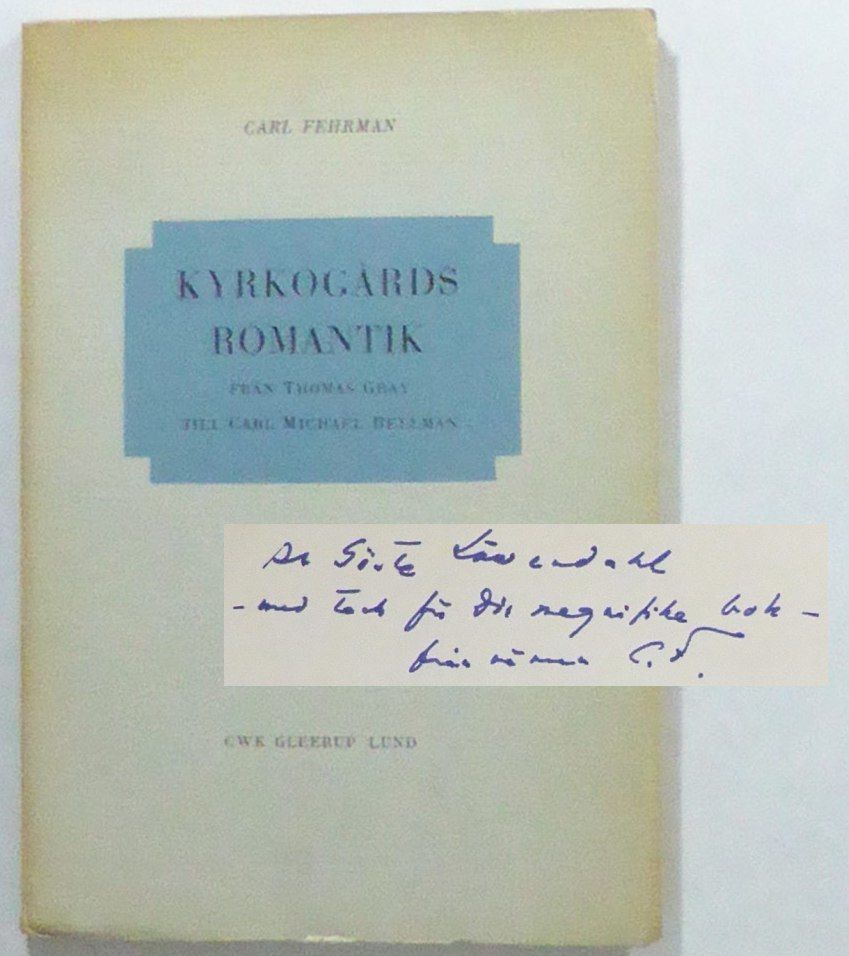 Lund; Gleerup, 1954. (Skrifter utgivna av Vetenskaps-Societeten i Lund 43 / Publications of the New Society of Letters at Lund 43). 25x17,5 cm. 178, (1, 1 blank) s. + plansch. Häftad med tryckt omslag. Ryggen något mörknad och det överdimensionerade omslaget aningen veckat i nedre marginalerna. Diskreta blyertsmarkering i yttermarginalen på några sidor. Fint ex. Dedikation: ""Dr Gösta Löwendahl - med tack för din magnifika bok - från vännen C. F."" Fehrman hänvisar till Löwendahls avhandling ""Vapensmedens Viktor Rydberg"" som publicerades samma år. Fehrman treats English and Swedish churchyard poetry of the 18th century. With a summary in English.