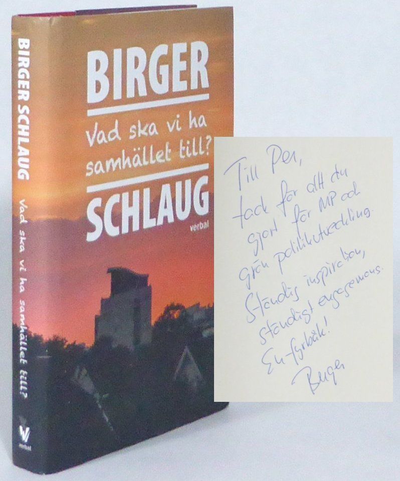 [Stockholm]; Verbal, 2020. 21,5x14 cm. 328 s. Förlagets pappband med tryckt skyddsomslag. Ryggändar och nedre pärmhörnen lätt tilltryckta. Några små mörka prickar på främre innerpärm samt främre försättsblad. Fint ex. Dedikation: ""Till Per [Gahrton], tack för allt du gjort för MP och grön politikutveckling. Ständig inspiration, ständigt engagemang. En fyrbåk! / Birger"". Schlaug tog över rollen som språkrör för Miljöpartiet efter Gahrton 1985.