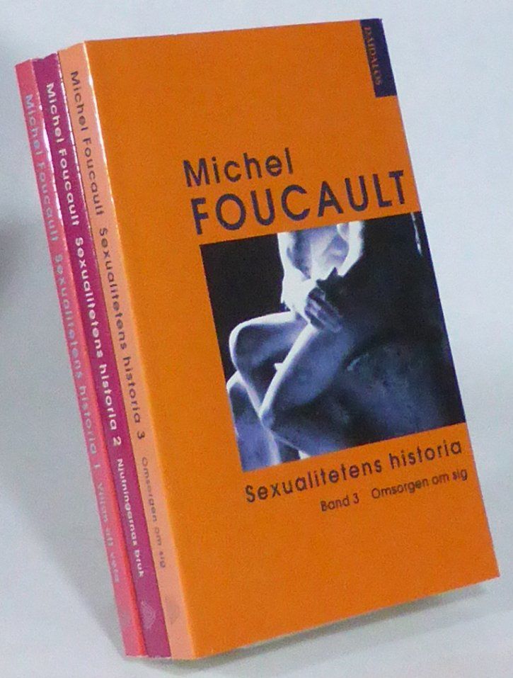 Göteborg; Daidalos, 2002-2004. Första volymen i andra tryckningen. Originalets titel: Histoire de sexualité (Paris, 1976-1984). 21x13,5 cm. 158 & 228 & 221, (1 blank) s. Tre volymer, häftade med tryckta omslag. Första och tredje volymen med nästan genomgående lätt hörnveck upptill. Fin uppsättning.