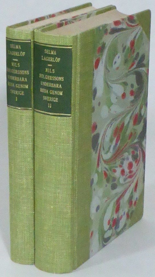 Stockholm; Bonniers, 1906-1907. (Läseböcker för Sveriges barndomsskolor utgivna av Alfr. Dalin och Fridtjuv Berg. 1). Originalupplagans 1:a-20:e tusende resp. 1:a-18:e tusende. 20x14 cm. (3, 1 blank), 237, (1, 2 blanka) s. + 24 planscher & (3, 1 blank), 486, (2) s. I andra volymen ingår planscherna i pagineringen. Illustrationerna utgörs främst av fotografier men även av teckningar av John Bauer, Vicke Andrén m. fl. Två osignerade senare gröna halvklotband med ryggetikett i grönt skinn, marmorerade pärmpapper och stänkmålade snitt. Omslag samt ryggremsa medbundna i första volymen, främre omslag medbundet i andra. Omslag av Arthur Sjögren. Exlibris för Anders Berglund. Namnteckning på främre omslagets verso i första volymen (Edith Lindgren, 1906). Ryggetiketten på första volymen obetydligt naggad. Den medbundna ryggremsan är nött samt har ett vertikalt veck. Fint ex. Afzelius, Selma Lagerlöfs bibliografi 126 & 136.