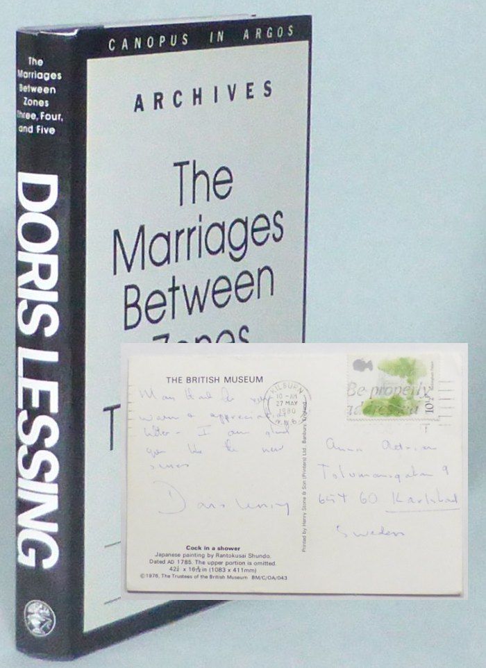 London; Jonathan Cape, 1980. First UK edition. 22,5x14,5 cm. (6, 2 blanks), 244, (1, 1 blank) pp. Publisher's boards with gilt title on spine, printed dustjacket. The jacket has a minimal loss at head of spine. There are a few small specks on the endpapers, and a slight nick at the top corner on the first three leaves. A fine copy of the second novel of five in the Canopus in Argos-series. This visionary and allegorical novel cycle blends science fiction and fantasy with myth and fable, and was not overly appreciated among her devoted readers at the time of publication. With a loosely inserted postcard from the author, stamped ""Kilburn / 1980"", and sent to Swedish teacher Anna Adrian in Karlstad,. Lessing writes: ""Many thanks for your warm & appreciative letter - I am glad you like the new series / Doris Lessing"".