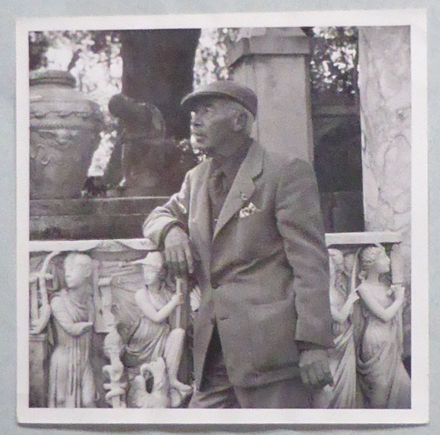 Carmel Valley, [1958]. 13x13 cm. Original photograph, contemporary print. With photographer George T. C. Smith's stamp at rear, and with a note in handwriting: ""Henry Miller at the Hearst Castle, San Simeon, California, 1958"". Miller (1891-1980) lived in the Big Sur area from 1944 to 1963, where the Hearst Castle is also situated, and probably paid a visit to it as it opened up to the public in 1958.