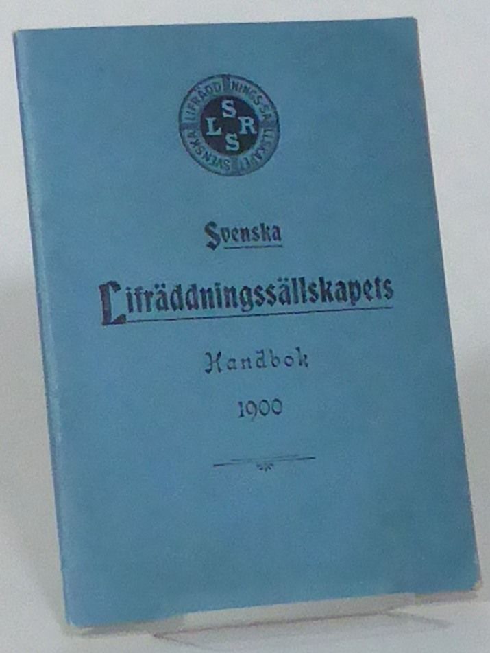 Stockholm; tryckt hos P. Palmquists Aktiebolag, 1900. 15x11 cm. 90 s. Illustrerad. Utgivarens tryckta vaxduksomslag. Namnteckning (Gustaf Platin) på främre omslagets verso. Omslaget med svaga hörnveck. Fint ex. Första handboken i livräddning av sällskapet som bildades 1898. Förutom räddningsövningar innehåller handboken en avdelning allmän simundervisning samt ett kapitel ""Isfärder och lifräddning ur isvak"".