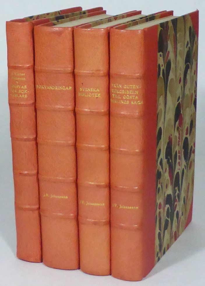 Stockholm; W&W, 1958 & 1945-1952. 24x16,5 cm. 251, (1) & 342, (1, 1 blank) & 339, (1, 2 blanka) s. + färgplansch & 317, (1, 2 blanka) s. Illustrerade. Fyra osignerade röda halvfranska band med förgyllda ryggtitlar, upphöjda bind, marmorerade pärmpapper och stänkmålade snitt. Omslagen medbundna, utom det bakre i tredje och fjärde volymen. Andra och tredje volymen med några små mörka prickar på ryggen. Andra volymen med en svag fläck vid rygghuvudet samt liten hörnförlust upptill på s. 5-58. Inlagorna med ett fåtal spridda småfläckar. Fin uppsättning. ""Försvar för boksamlaren"" utgavs ursprungligen 1943 och innehåller ""Försvar för boksamlaren"", ""Om oskurna originalupplagor med omslag"", ""Svensk litteratur genom fem sekler. Randanteckningar till en antikvariatkatalog"", ""En biblioteksman bland sina egna böcker"". ""Bokvandringar"" innehåller Eric Österlund: ""Bokvandringar"", Erik A. Ohlson: ""Det var en gång... Ur barn- och ungdomsläsningens historia"", Nils Afzelius: ""Carl Michael Bellman, bibliofil och samlare"", S. Hallberg: ""Lars Månsson i Tranemåla och hans boksamling"" / Johansson: ""Snoilsky som bibliofil"". ""Svenska bibliotek"" innehåller Carl Björkman: ""Mitt bibliotek"", Per A. Sjögren: ""Åke Eliaesons Goethe- och Tegnér-samlingar"", Axel Friberg: ""Advokat Ivar Morssings bibliotek"", Sten Lindroth: ""Erik Wallers bibliotek"", Nils Afzelius: ""Civilingenjör Sten Westerbergs bibliotek"", Bengt Åhlén: ""Professor Olof Östergrens bibliotek"". Fjärde volymen innehåller en genomgång och presentation av böcker ur Thore Virgins boksamling. Med en gåvotillskrift i tredje volymen: ""Hjalmar Lundgren med gammal vänskap från förläggaren"".